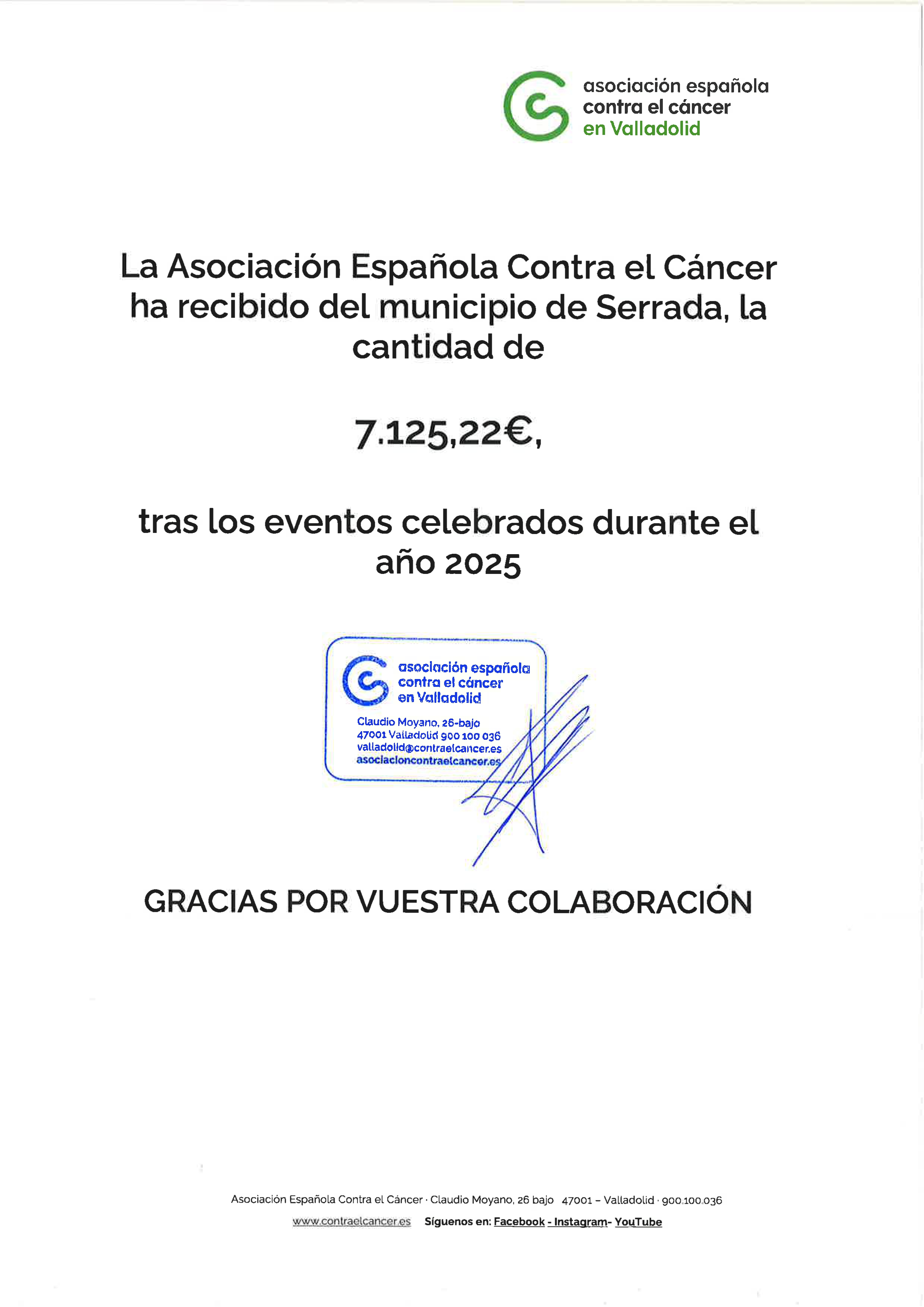 Desde la Junta Local de la ACCE en Serrada, os damos las gracias a todos los vecinos y vecinas por vuestra participación en los distintos eventos organizados, cuya recaudación asciende a 7.125,22€. Gracias al pueblo de Serrada por hacerlo posible.