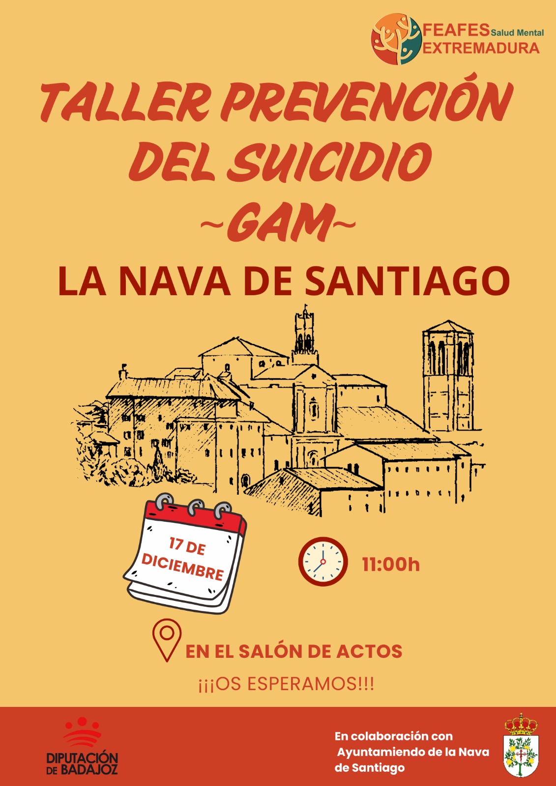 El próximo 17 de diciembre, a las 11:00 h, tendrá lugar en el Salón de Actos de La Nava de Santiago un taller de prevención del suicidio, organizado por FEAFES Salud Mental Extremadura.
