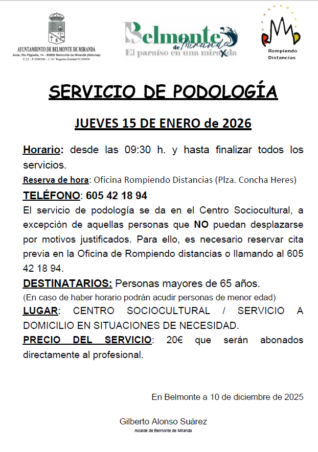 Se informa que el lunes, 12 de enero, se cierra la lista del servicio.Es necesario solicitar cita con antelación. Para pedir cita, llame al teléfono: 605 42 18 94