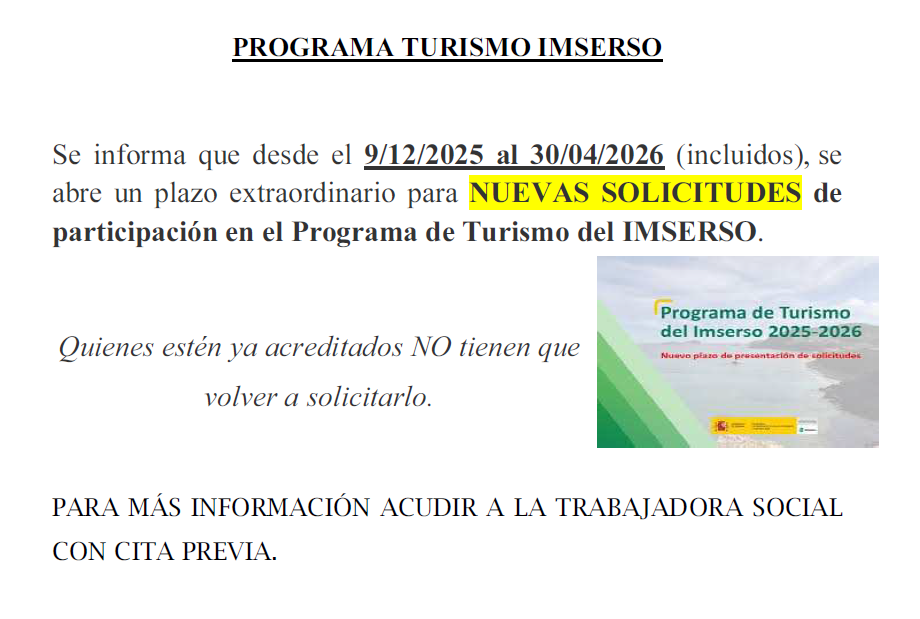 PARA MÁS INFORMACIÓN ACUDIR A LA TRABAJADORA SOCIAL CON CITA PREVIA.