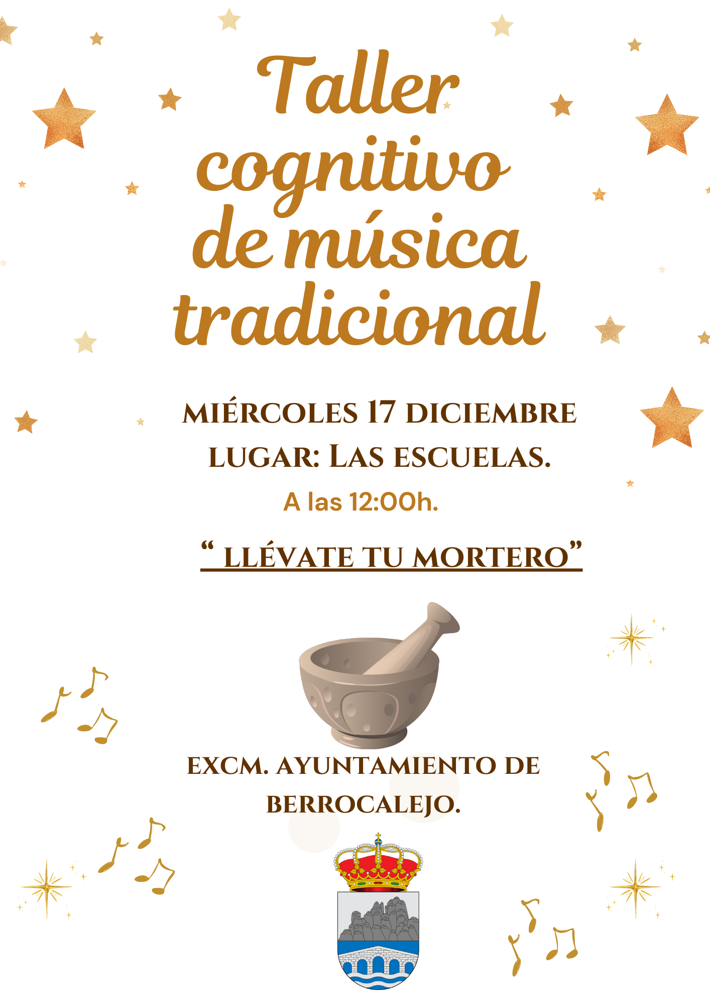 SE RECUERDA QUE MAÑANA MIÉRCOLES 17 DE DICIEMBRE A LAS 12:00 Hrs. EN LAS ESCUELAS, SE REALIZARÁ EL TALLER COGNITIVO DE MÚSICA CON MORTEROS.¡ANÍMATE Y NO OLVIDES LLEVAR TU MORTERO!