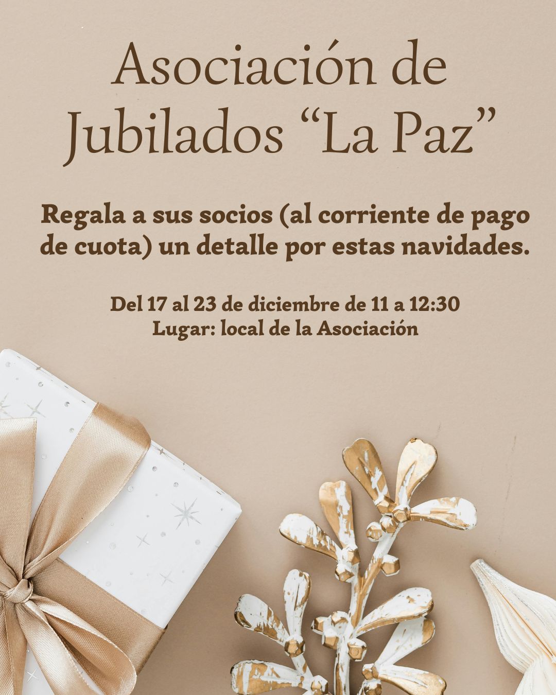 La Asociación de Jubilados La Paz de Casas IbÑñez informa que se entregarÑ un regalo a todos los socios que estén al corriente de pago de la cuota.