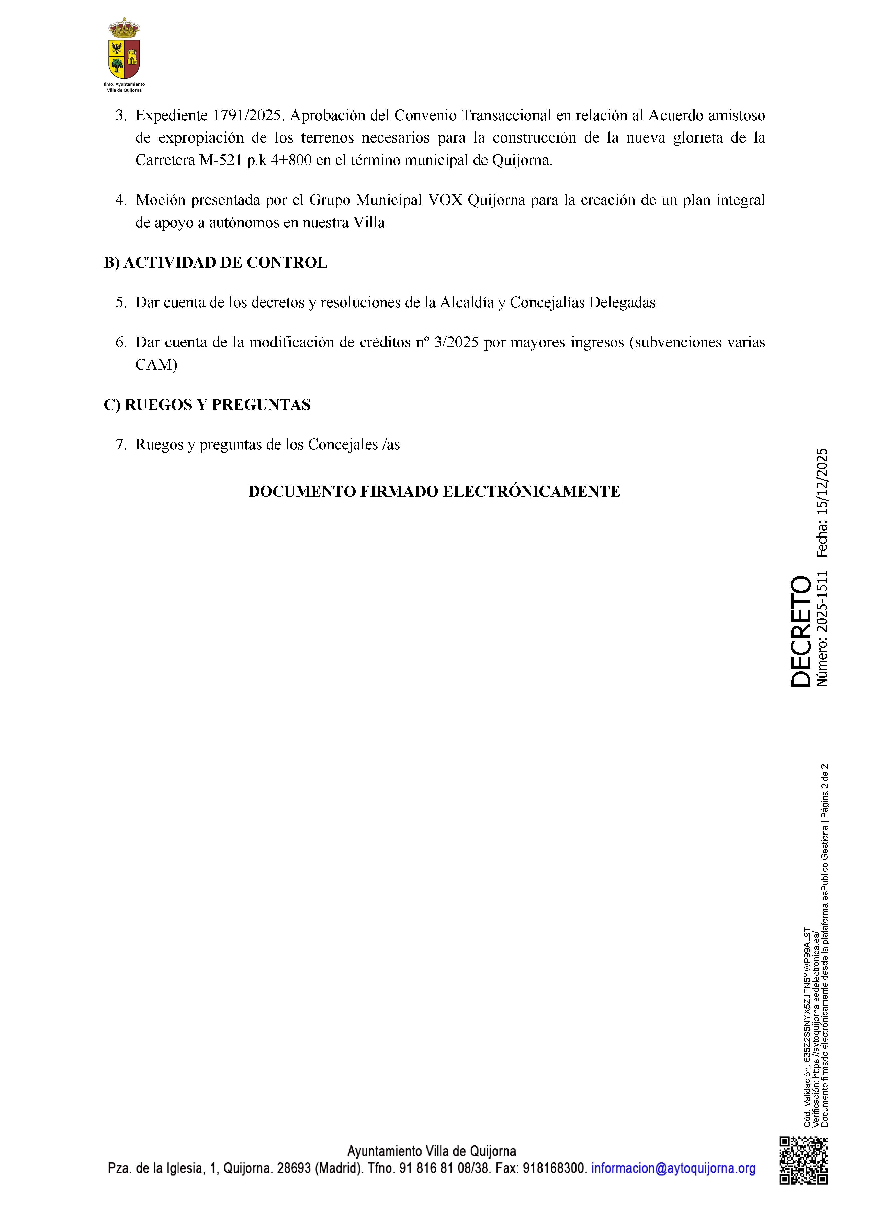 CONVOCATORIA PLENO EXTRAORDINARIO.Orden del día del Pleno previsto para el jueves, 18 de diciembre, a las 18.25 horas, en el Salón de sesiones de la casa Consistorial.