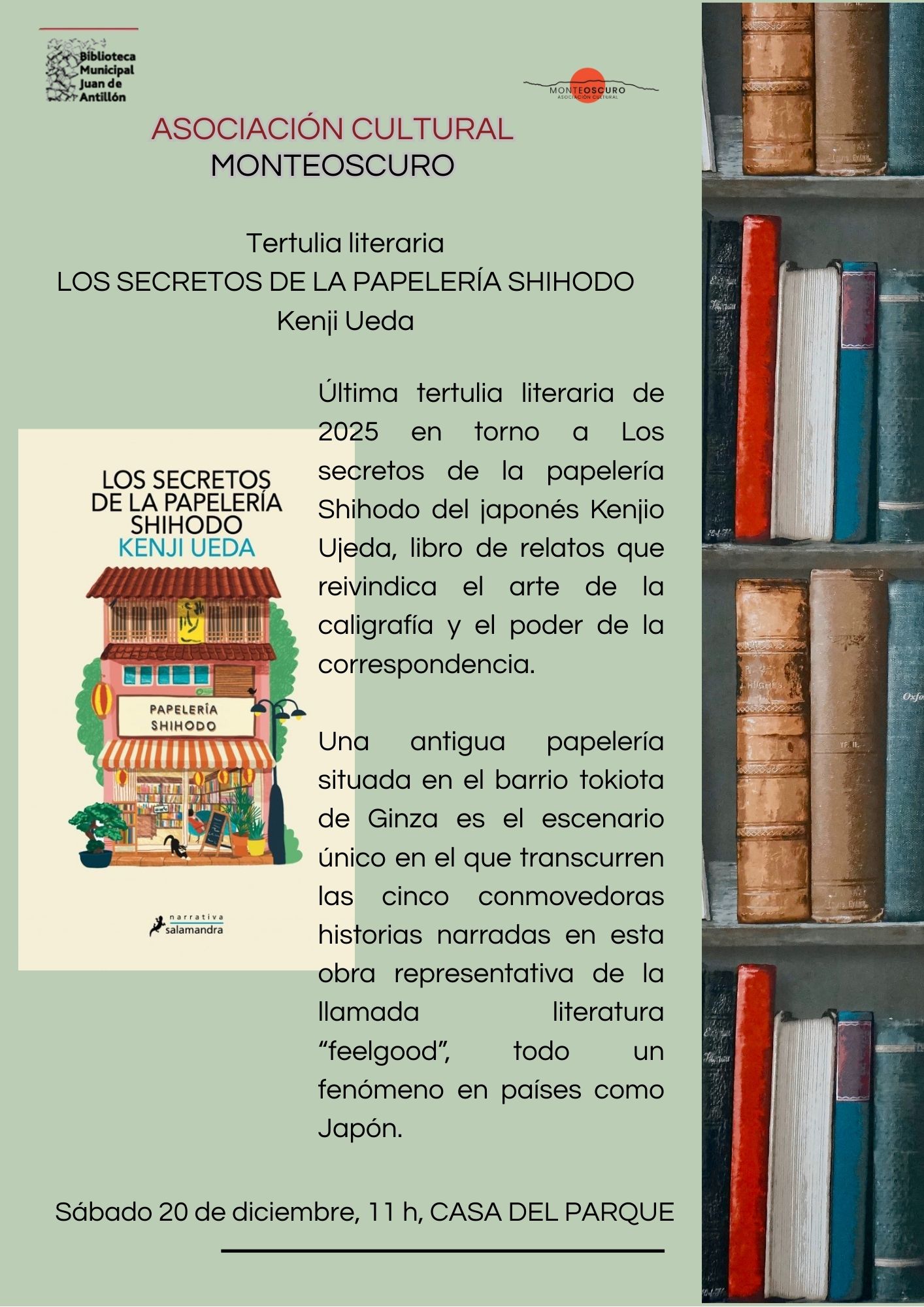 Tendrá lugar a las 11:00 horas, en la Casa del Parque, se comentará el libro Los secretos de la papelerÃa Shihodo, de Kenji Ueda, un libro de relatos que reivindica el arte de la caligrafÃa y el poder de la correspondencia.