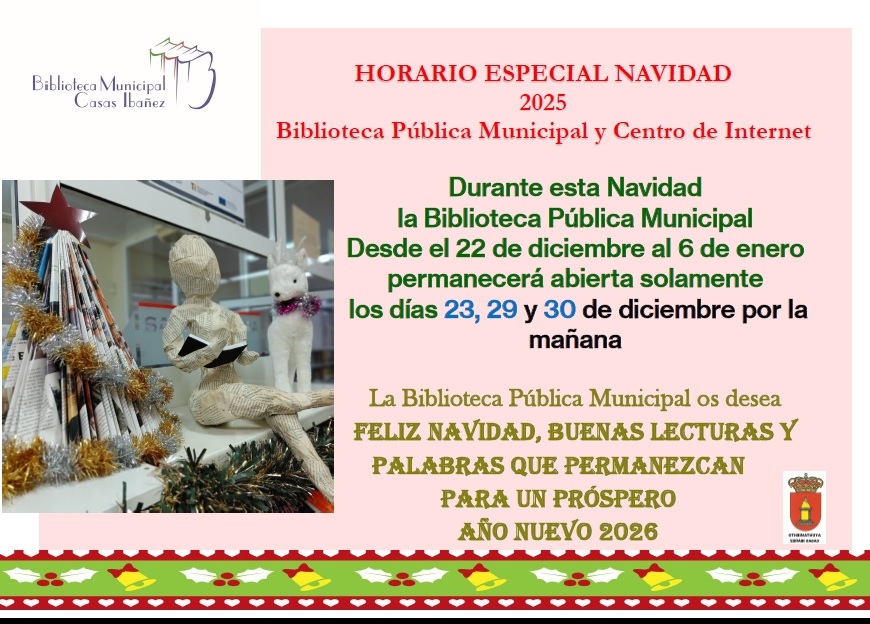 ℹ Información Biblioteca Municipal:En la imagen tienes toda la información sobre el calendario y horario de apertura de la 📚Biblioteca Municipal de Casas Ibáñez, con motivo de las fiestas navideñas.