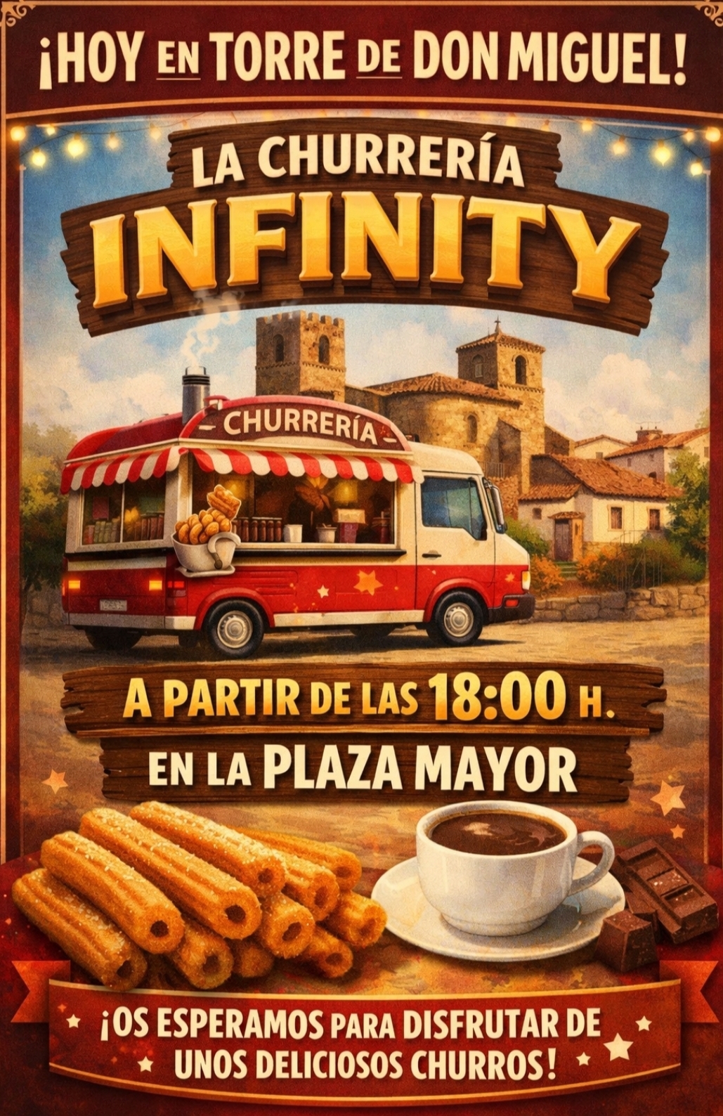 La Churrería Infinity estará hoy en Torre de Don Miguel a partir de las 18:00 horas, en la Plaza Mayor.