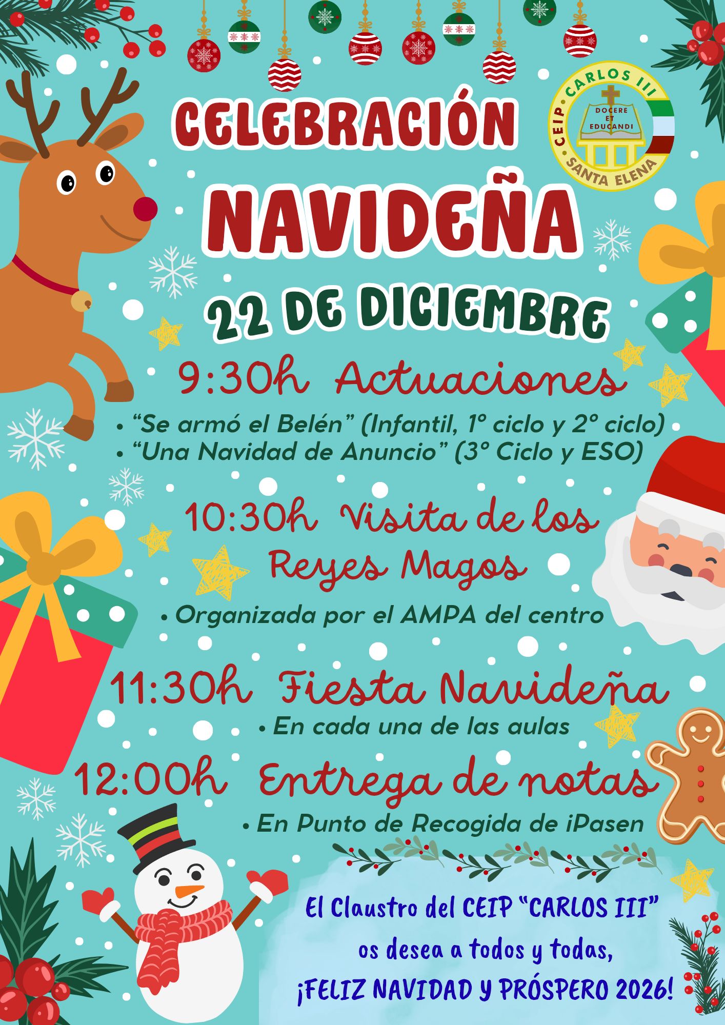 Cartel con todas las actividades programadas para el lunes, 22 de diciembre y aprovechamos la ocasión para invitar a todas las familias del centro para que vengan a ver las actuaciones navideñas que han preparado con mucha ilusión nuestros grandes artistas😉🎅🎄