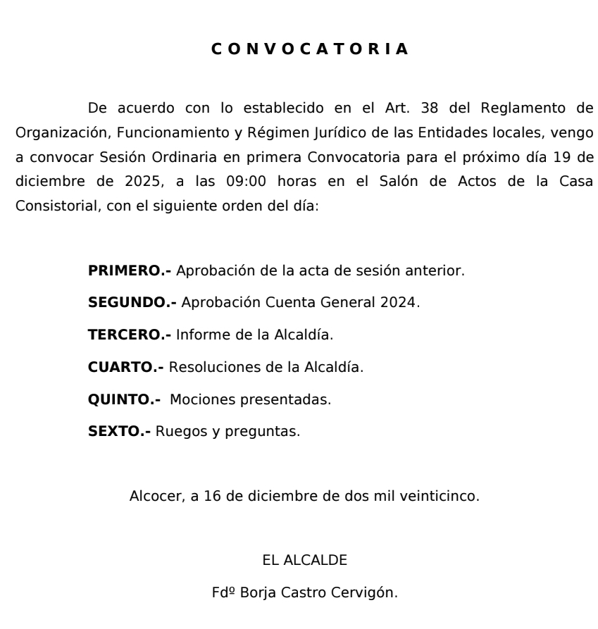A las 9:00h está convocada la última sesión del año. Con el orden del día que aparece en la imagen.