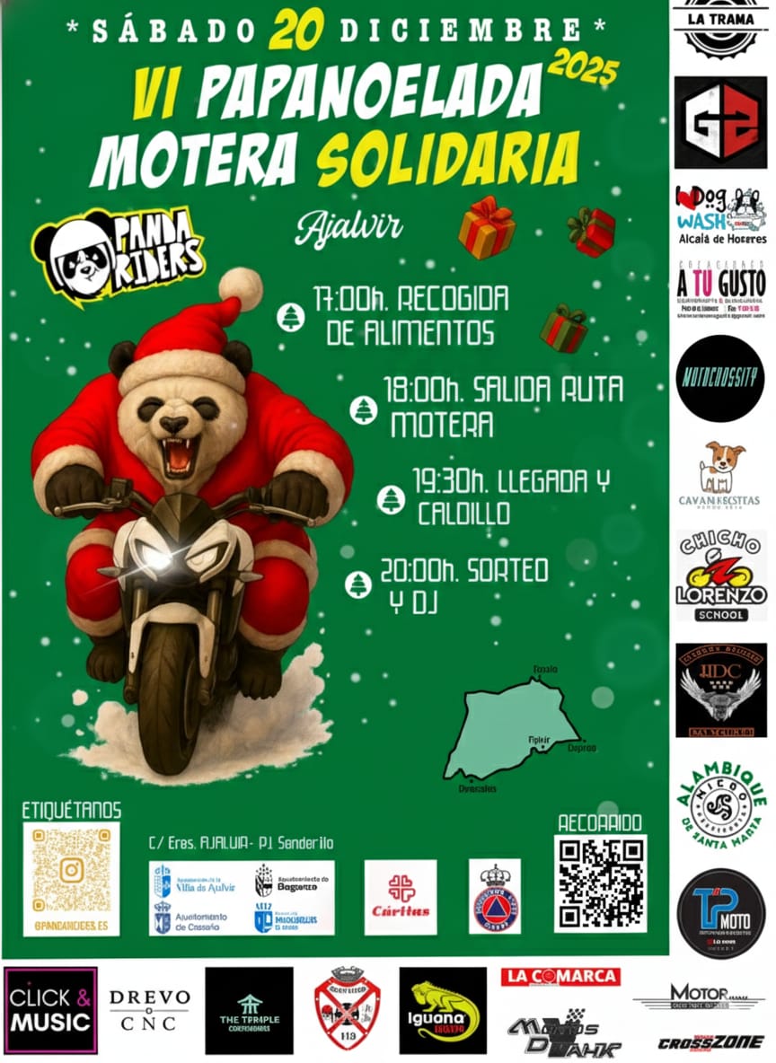 VI PAPANOELADA MOTERA SOLIDARIA Sábado 20 de Diciembre 17:00 Recogida de Alimentos en la C/. Eras18:00 Salida Motera19:30 Llegada y entrega de un caldo caliente para todos los asistentes. 20:00 Sorteo y Dj