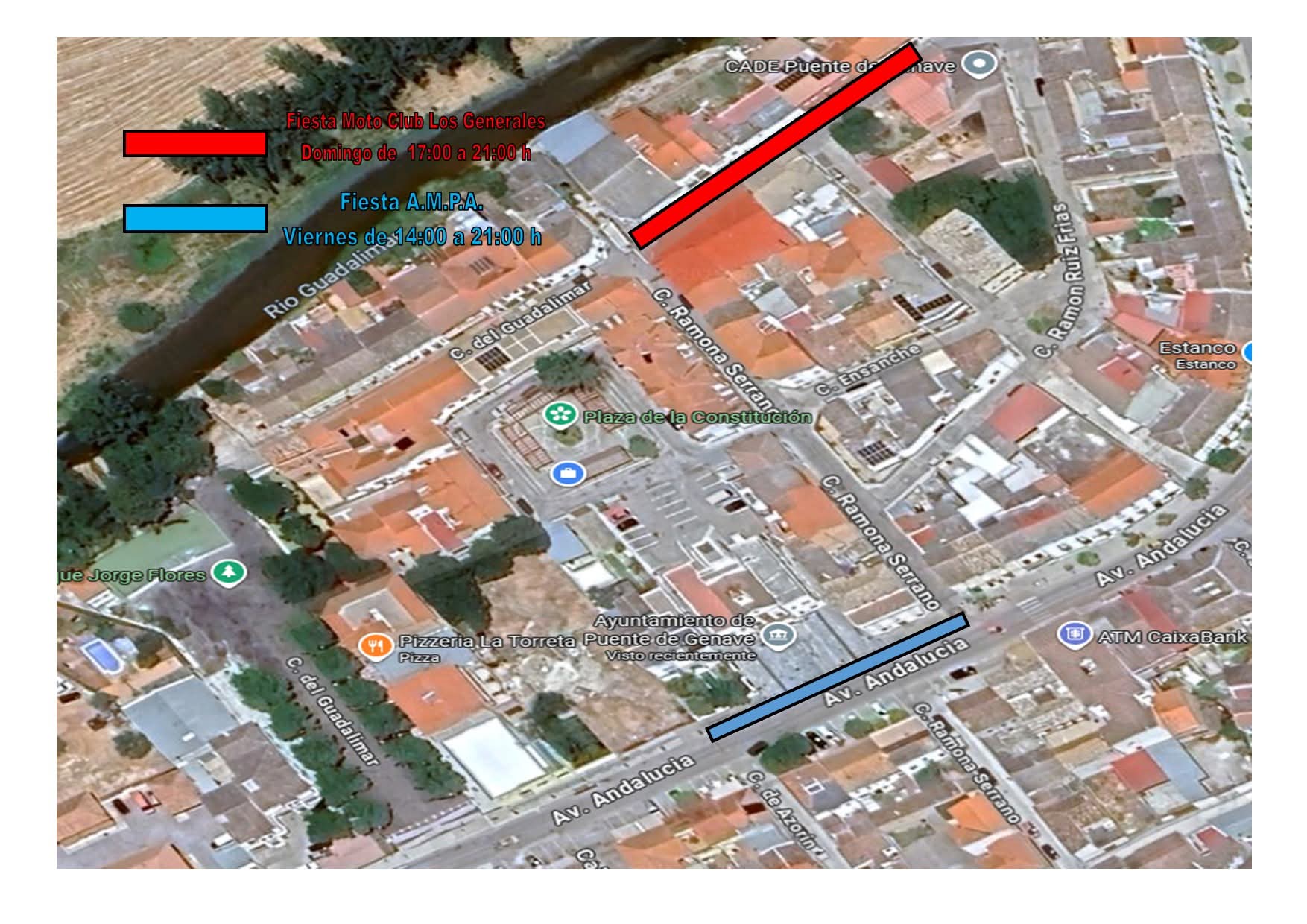 El viernes 19 de 14:00 a 21:00 h estará prohibido aparcar delante del ayuntamiento por la fiesta del A.M.P.A y el domingo 21 se cortará de 17:00 a 21:00 h la Calle Guadalimar por la fiesta del Moto Club Los Generales