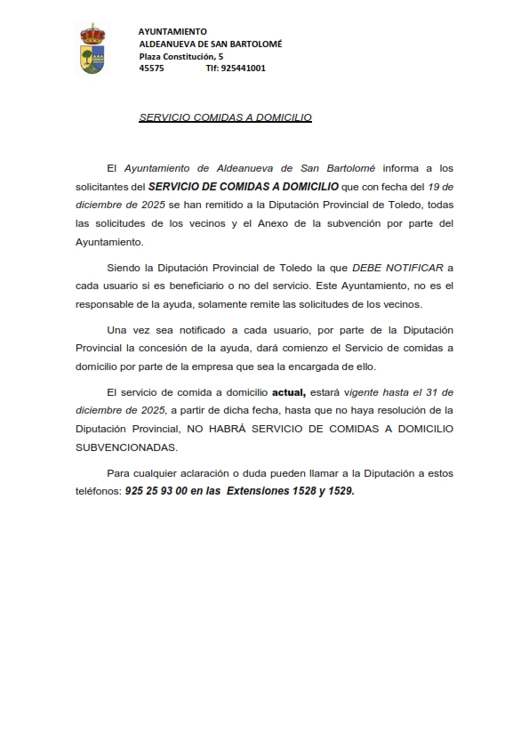 El Ayuntamiento de Aldeanueva de San Bartolomé informa a los solicitantes del SERVICIO DE COMIDAS A DOMICILIO que con fecha del 19 de diciembre de 2025 se remitirán a la Diputación Provincial de Toledo, todas las solicitudes de los vecinos y el Anexo de la subvención por parte del Ayuntamiento.