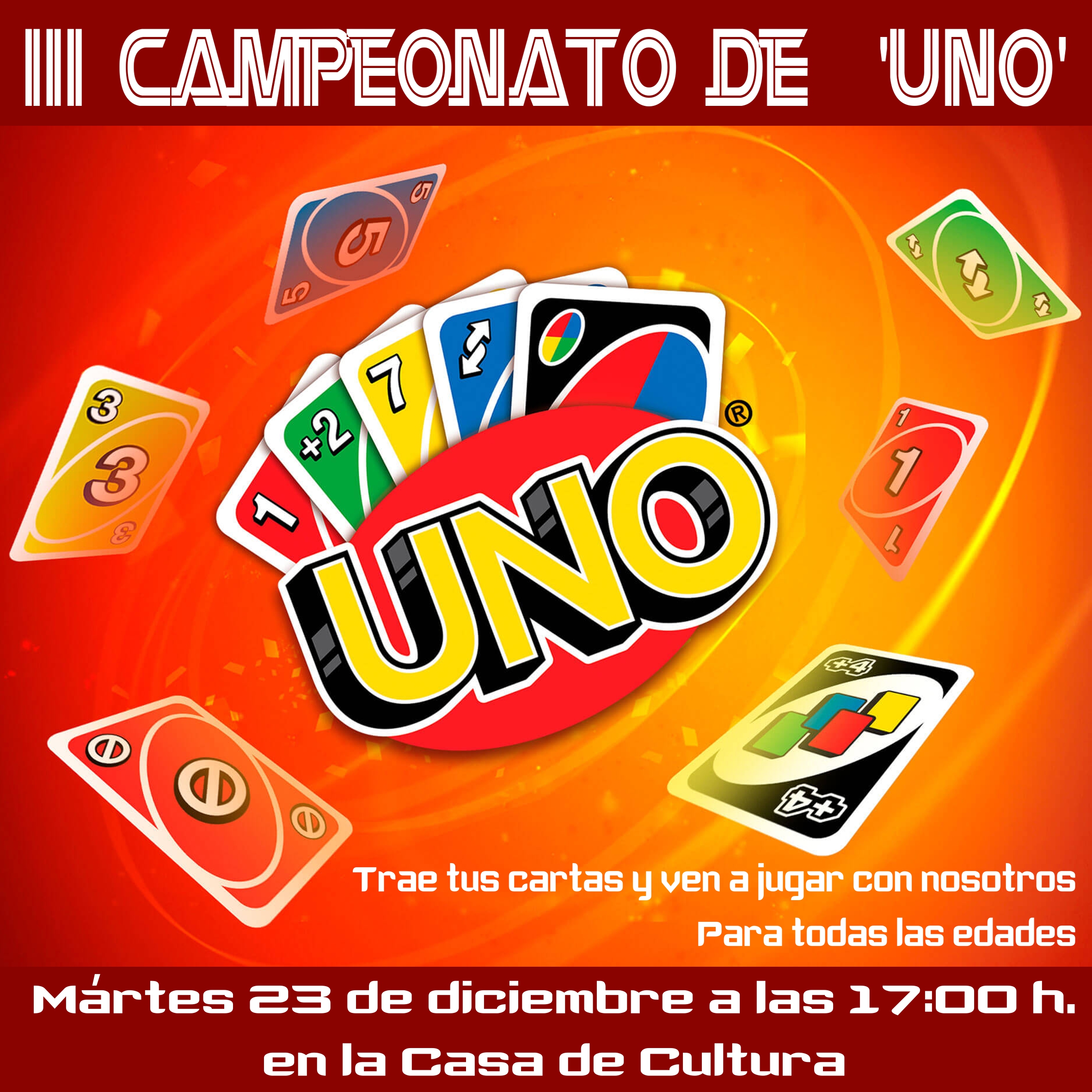 MAÑANA MARTESIII Campeonato de UNOMartes 23 de diciembre17:00 hCasa de Cultura