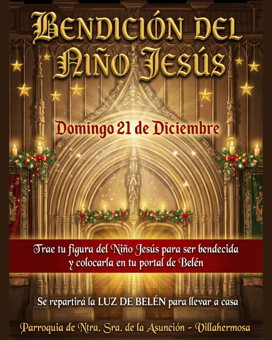 Este próximo domingo, 21 de diciembre, se realizará la bendición de las figuras del Niño Jesús de los vecinos y vecinas de nuestra localidad, que lo deseen, en la Parroquia de Nuestra Señora de la Asunción, para ser colocadas en sus portales de Belén.