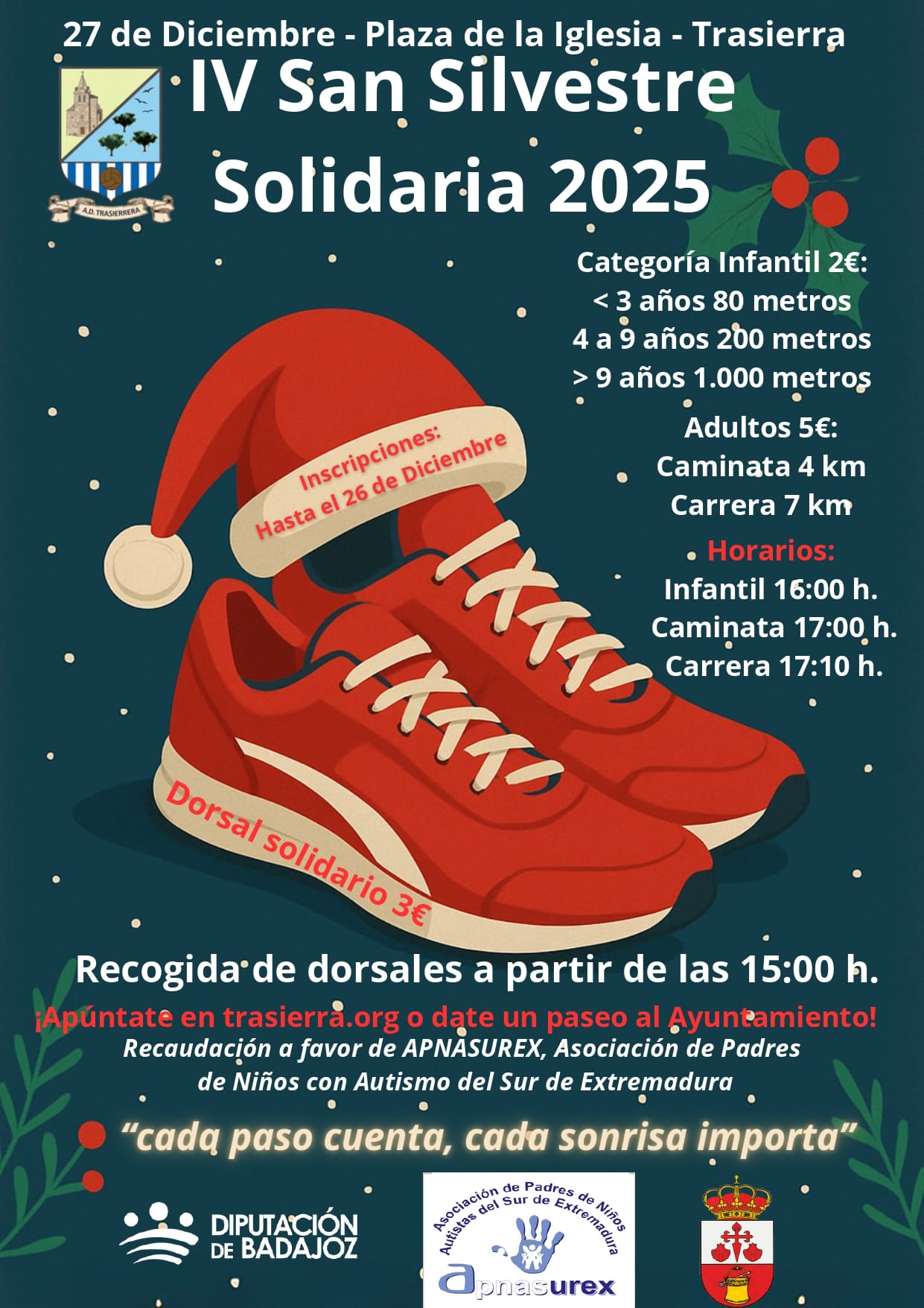 Abierto el plazo de inscripciones para la participación en la cuarta edición de la tradicional San Silvestre Solidaria que se celebrará el próximo día 27 de diciembre y cuyo punto de partida será la Plaza de la Iglesia de Trasierra.