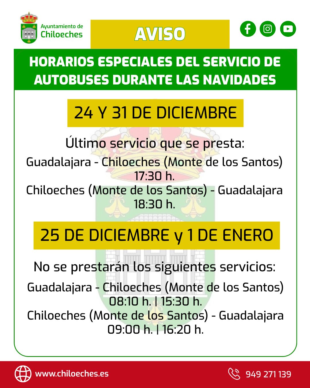 El Ayuntamiento de Chiloeches informa sobre las modificaciones en el servicio de autobuses para los días clave de estas fiestas. Por favor, tengan en cuenta estos cambios para planificar sus desplazamientos: