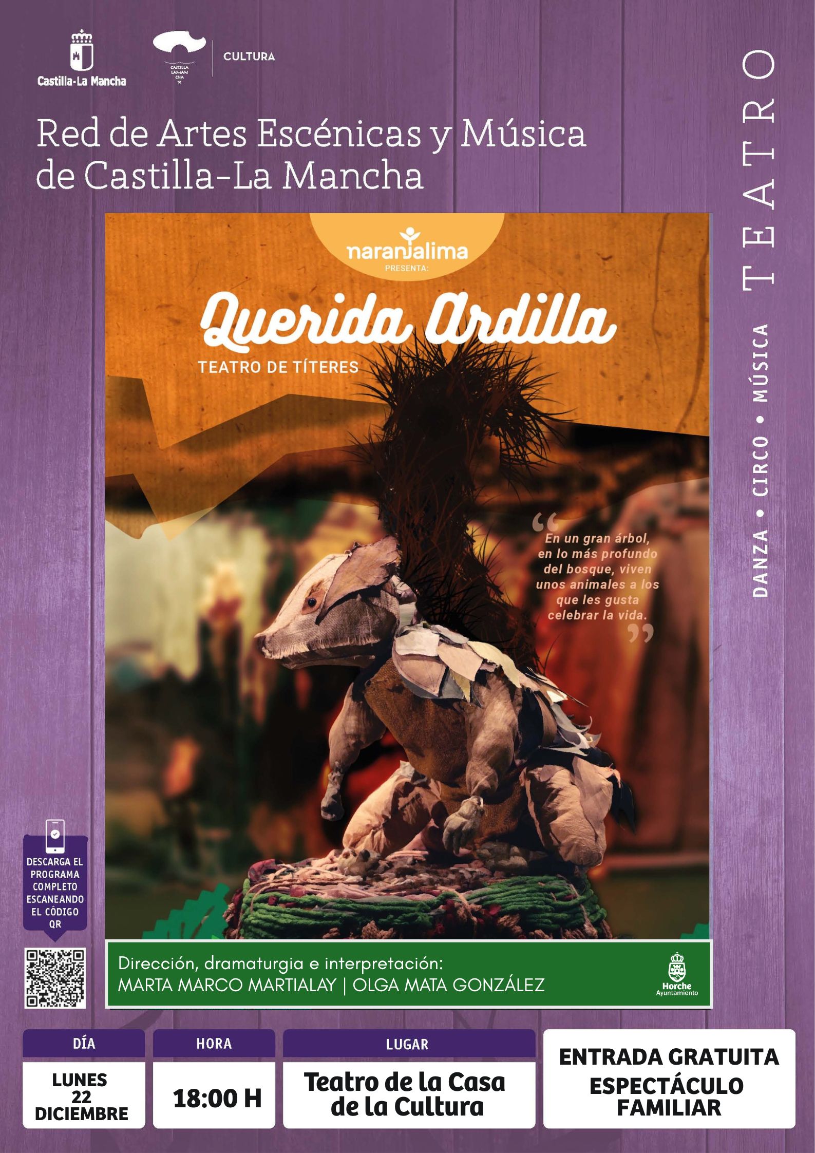 A través de la Red de Artes Escénicas y Música de Castilla-La Mancha llega a Horche una propuesta mágica para estas fechas navideñas. No te pierdas el espectáculo de teatro de títeres: "Querida Ardilla".