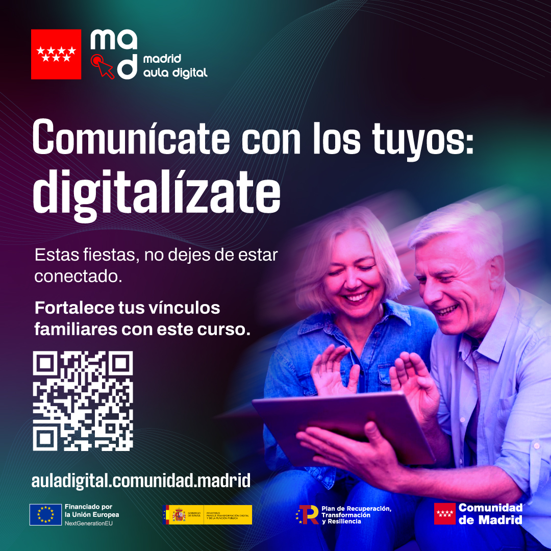 Estas fiestas, no tengas problemas para comunicarte con tus familiares. En Madrid Aula Digital, te presentamos un curso gratuito y fácil de entender, que te ayudará a mantenerte conectado con familia y amigos, sin importar la distancia.