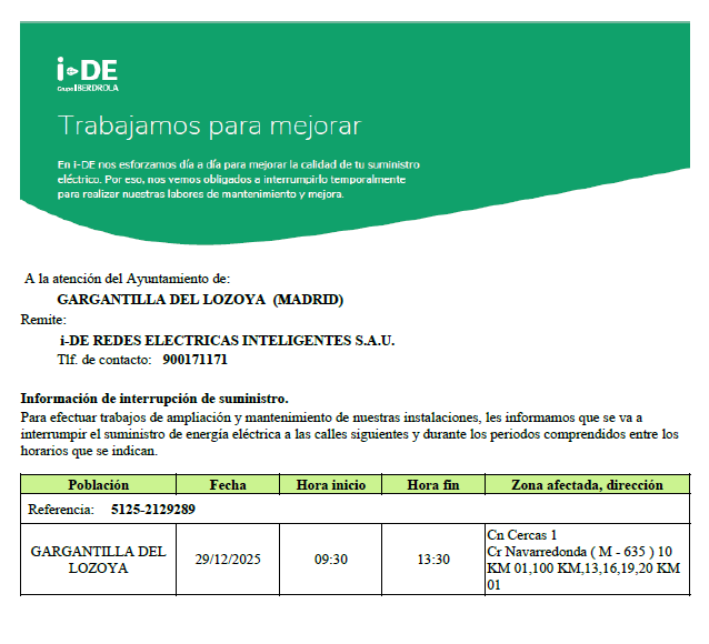 Para efectuar trabajos de ampliación y mantenimiento de nuestras instalaciones, les informamos que se va a interrumpir el suministro de energía eléctrica a las calles siguientes y durante los periodos comprendidos entre los horarios que se indican.