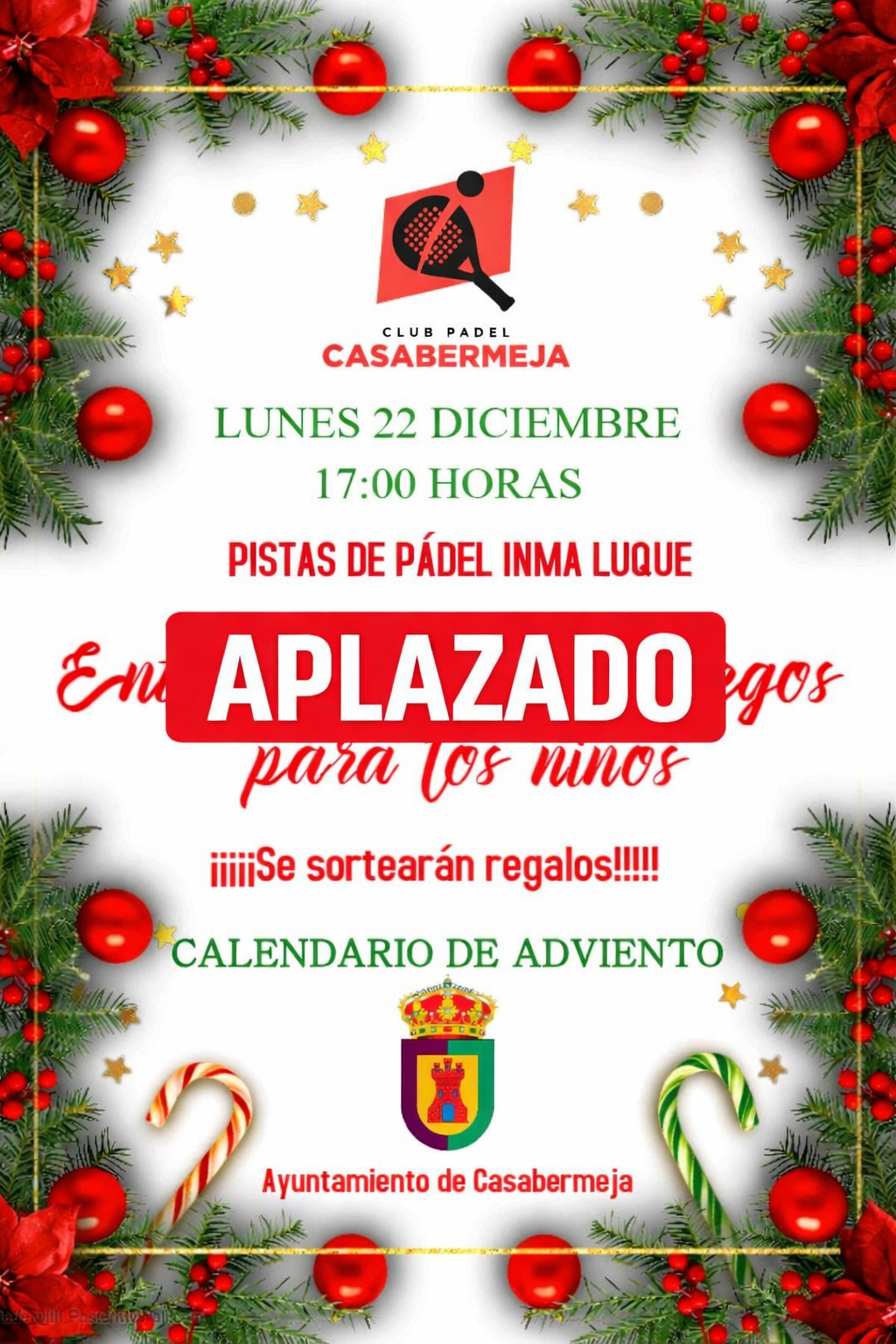 Desde el Club Pádel Casabermeja y el Ayuntamiento de Casabermeja informamos que el entrenamiento con juegos para los niños, previsto para hoy dentro del Calendario de Adviento, queda aplazado debido al estado de las pistas, que se encuentran muy mojadas y no permiten desarrollar la actividad con seguridad.
