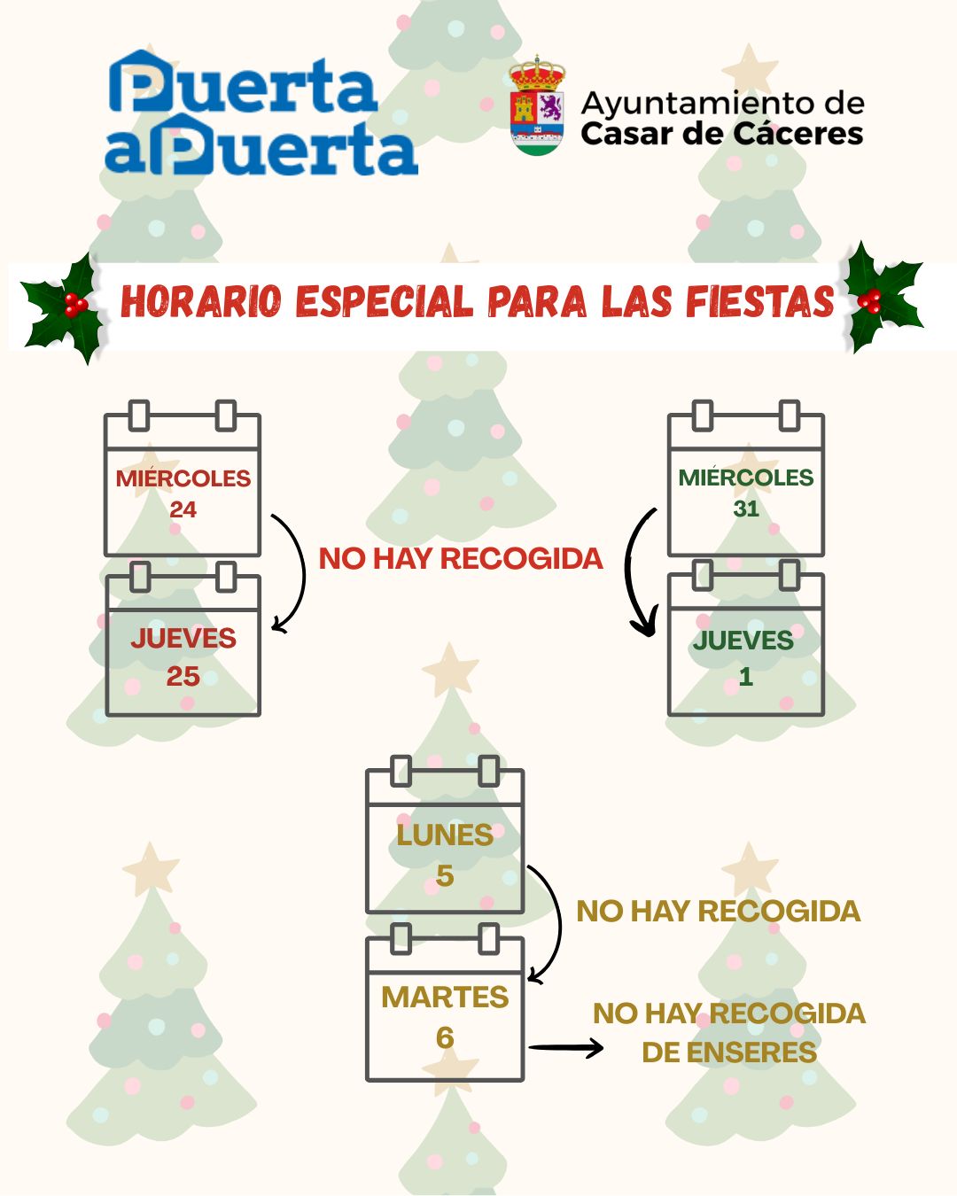 Os compartimos los días en los que no habrá recogida de basura. El resto de días habrá recogida normal.