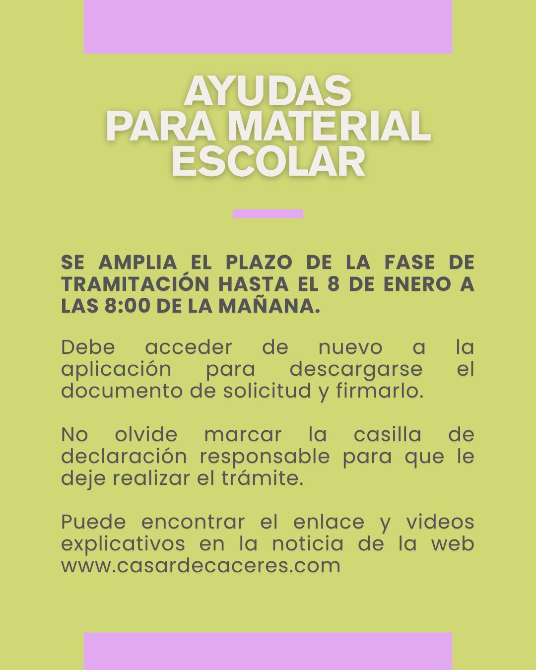 Se amplía el plazo de fase de tramitación para firmar la solicitud de ayuda de material escolar hasta el 8 de enero.