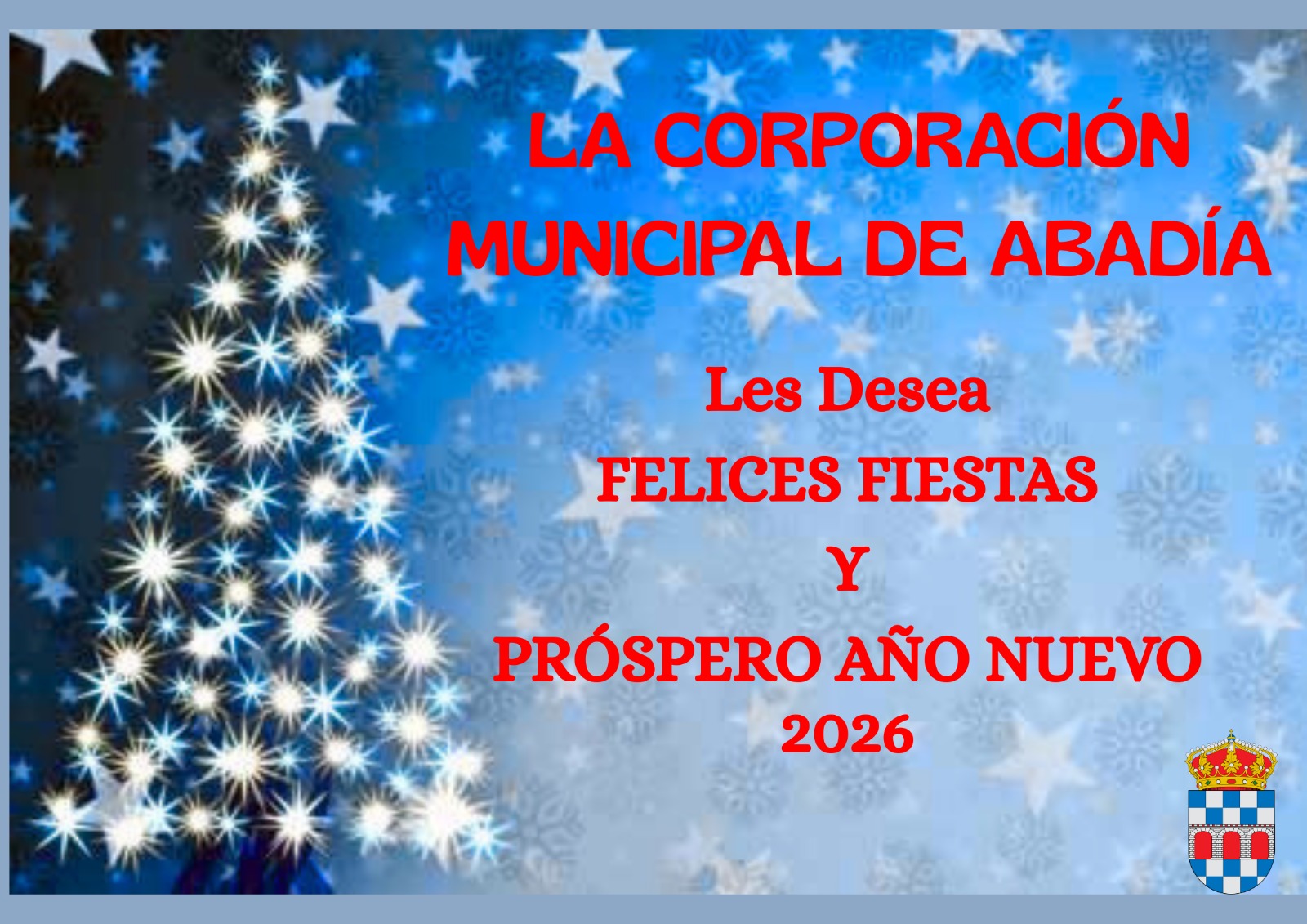LA CORPORACIÓN MUNICIPAL DEL AYUNTAMIENTO DE ABADÍA, DESEA A TODOS SUS VECINOS ¡¡FELIZ NAVIDAD!! Y UN ¡¡PRÓSPERO AÑO 2026!!
