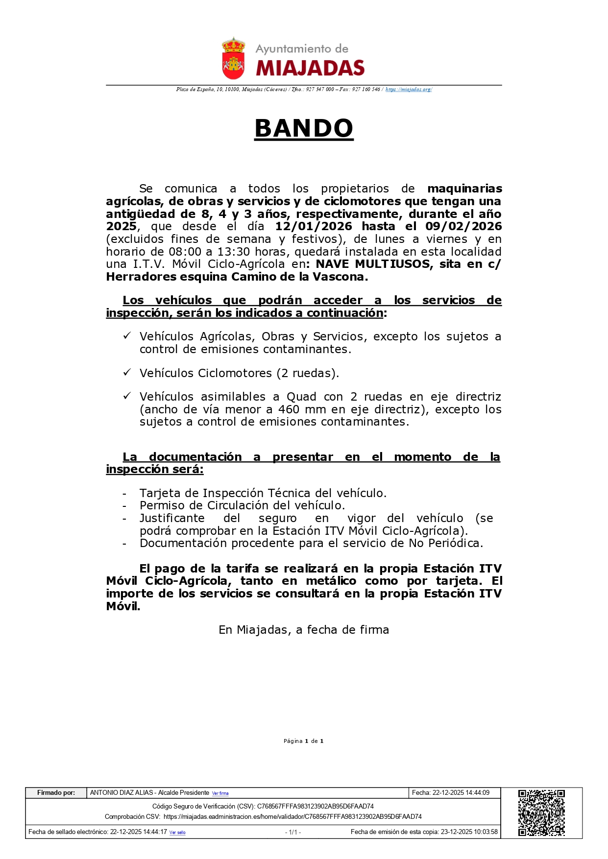Del 12/01//2026 al 09/02/2026, de 8:00 a 13:30 horas, en los Pabellones Multiusos de Miajadas.Puedes coger tu cita en el Ayuntamiento de Miajadas, de 09:00 a 13:00 horas, a partir de este momento.