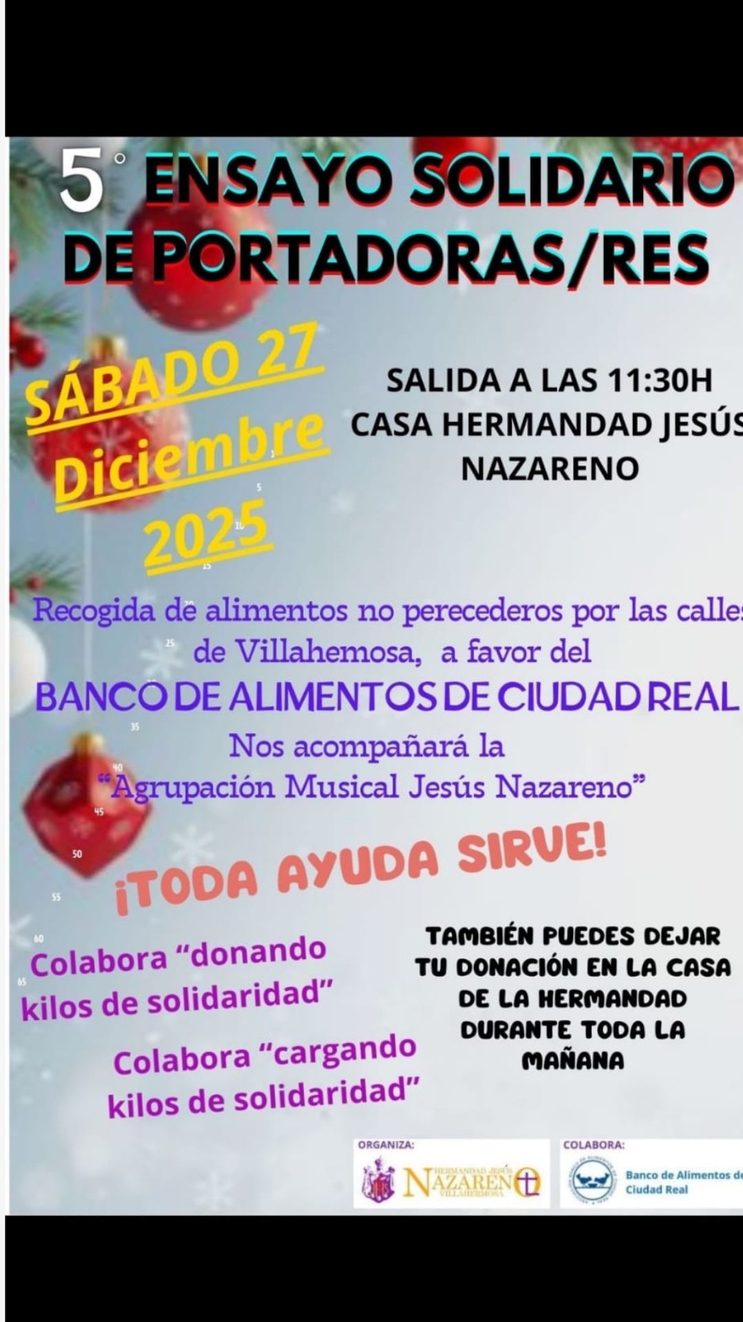 El sábado 27 de diciembre tendrá lugar el 5º Ensayo Solidario de Portadoras/res, con salida a las 11:30 horas desde la Casa Hermandad de Jesús Nazareno. Durante la mañana se realizará una recogida de alimentos no perecederos por las calles de Villahermosa a favor del Banco de Alimentos de Ciudad Real, acompañados por la Agrupación Musical Jesús Nazareno.