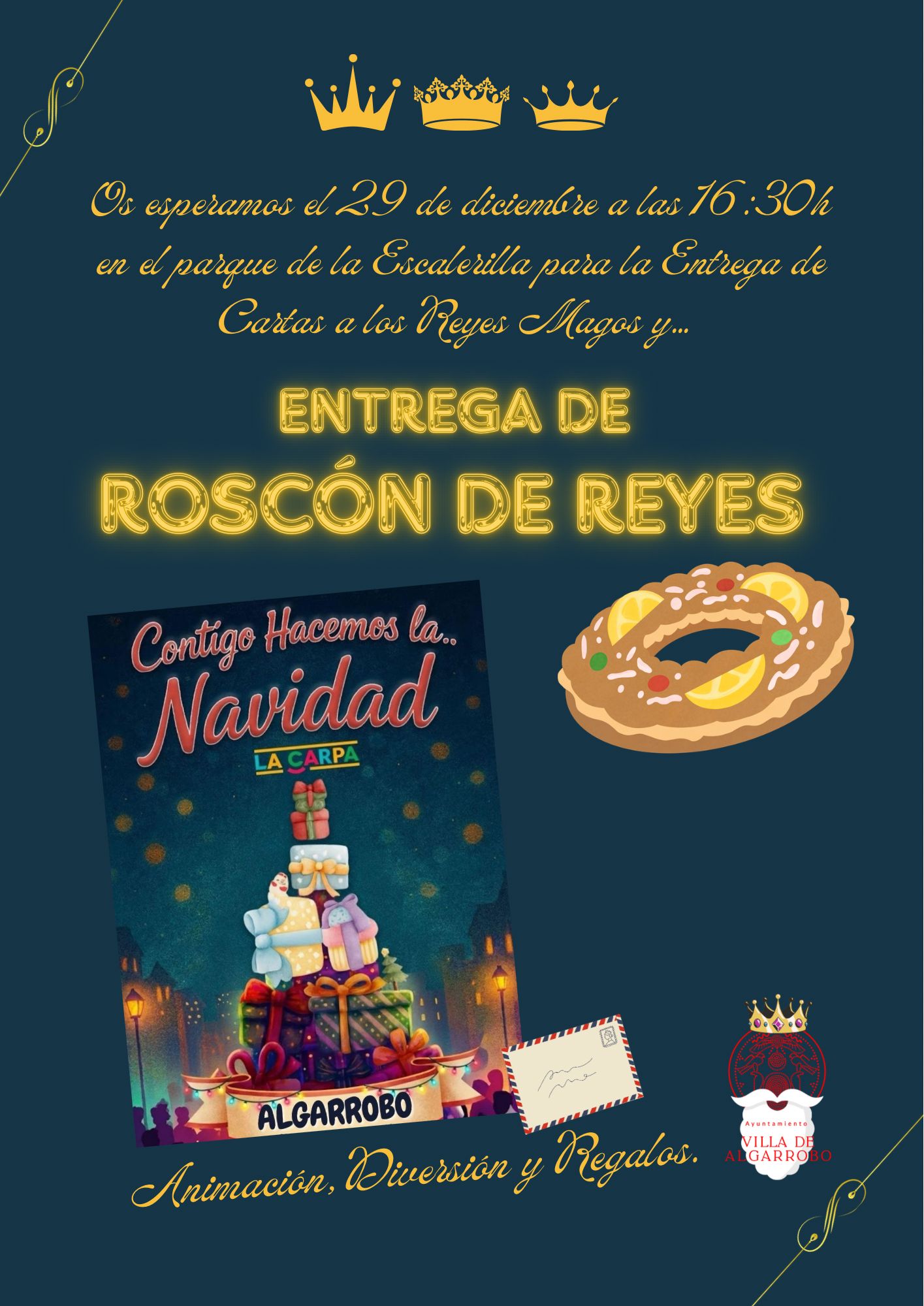 Este 29 de diciembre a las 16:30 h, el Parque de la Escalerilla se llenará de magia con la Entrega de Cartas a los Reyes Magos 👑📬 y, como gran novedad, se incorpora la entrega de Roscón de Reyes 🍩✨ para endulzar una tarde llena de animación, diversión y regalos 🎪🎁, pensada para disfrutar en familia y vivir la tradición con ilusión, sabor y espíritu navideño en Algarrobo ❤️🎄👨👩👧👦