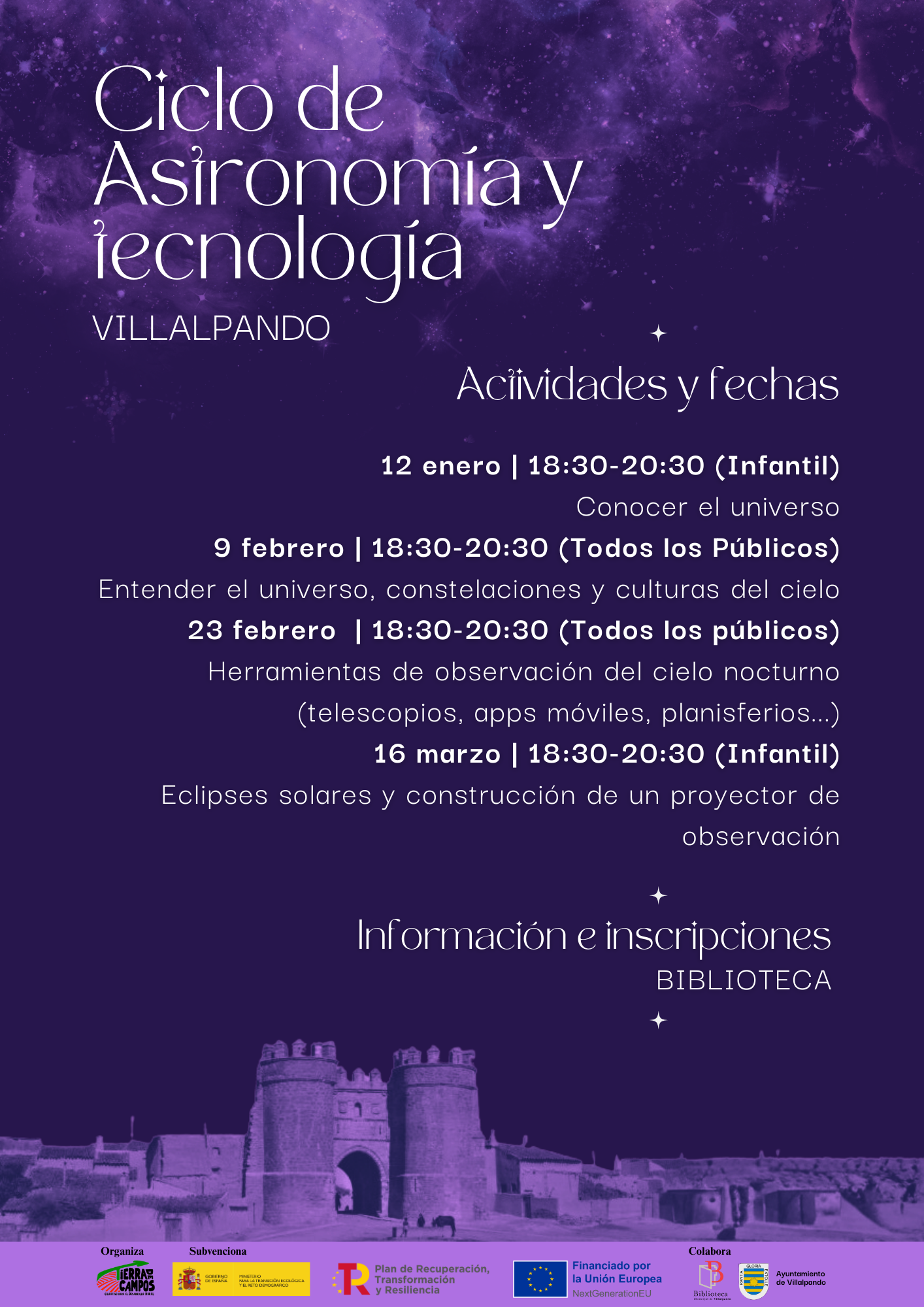 Mas información e inscripciones en la biblioteca de manera presencial, llamando al 980660071 o a través del correo electrónico bibliotecavillalpando@aytovillalpando.es