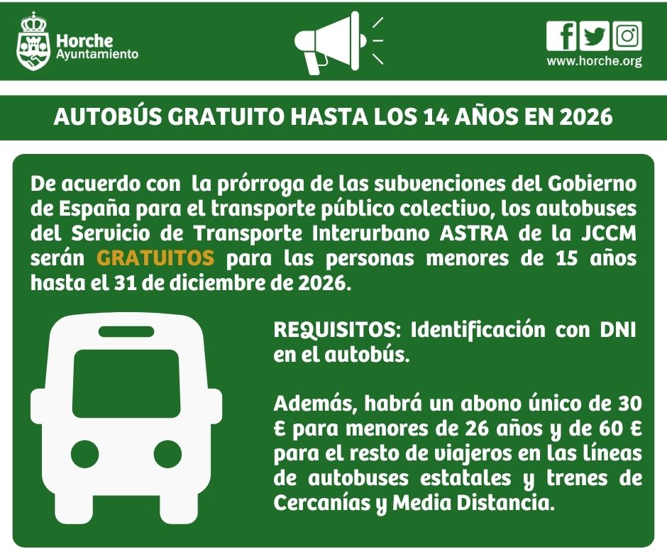 La gratuidad del Servicio de Autobuses ASTRA de Horche para niños y niñas hasta los 14 años se prorroga durante todo el 2026 gracias a la aportación del Ministerio de Transportes y Movilidad Sostenible, la cual se extiende a los trenes de Cercanías y Media Distancia, así como a los autobuses a Madrid.