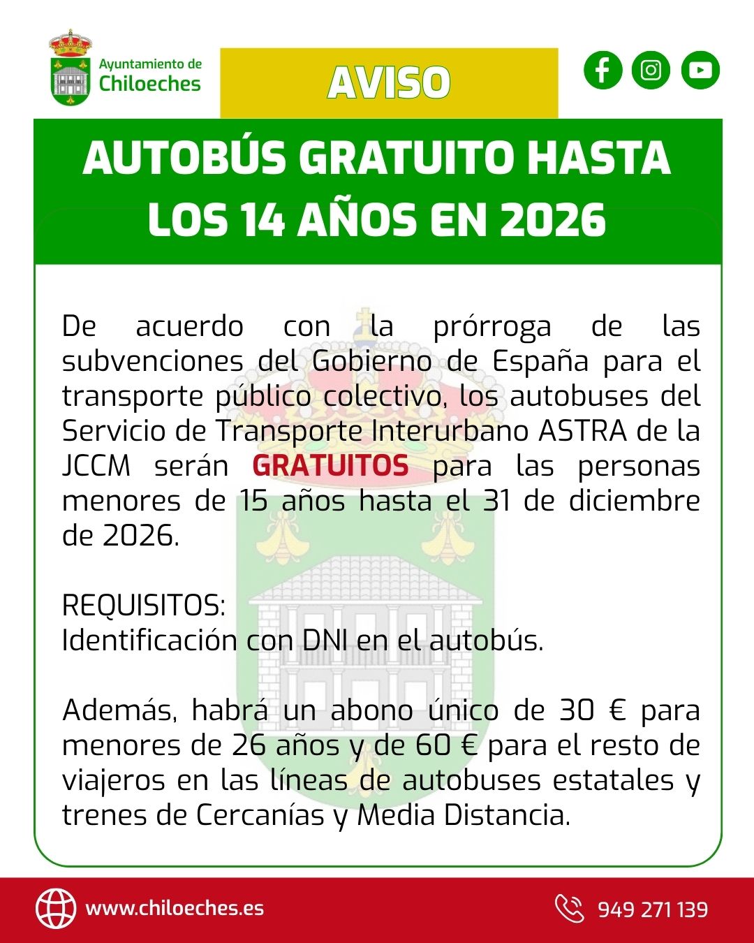 La gratuidad del Servicio de Autobuses ASTRA de Chiloeches para niños y niñas hasta los 14 años se prorroga durante todo el 2026 gracias a la aportación del Ministerio de Transportes y Movilidad Sostenible, la cual se extiende a los trenes de Cercanías y Media Distancia, así como a los autobuses a Madrid.