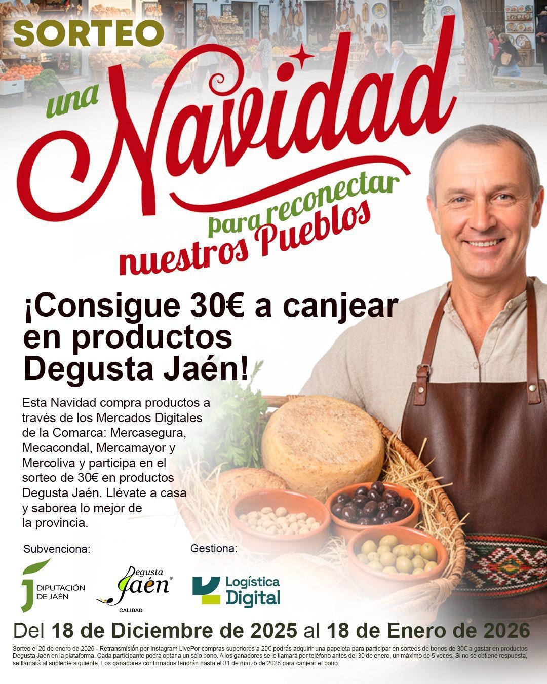 ¿Te imaginas llevarte a casa lo mejor de nuestra provincia totalmente gratis? Participa en el sorteo Una Navidad para reconectar nuestros Pueblos y consigue uno de los bonos de 30€ para canjear en productos Degusta Jaén. 😋🥖 ¿Cómo participar? Es muy fácil: Realiza tus compras a través de los Mercados Digitales de la Comarca: Mercasegura, Mercondal, Mercamayor o Mercoliva. 💻🛒 Por cada compra superior a 20€ obtendrás una papeleta para entrar en el sorteo de bonos de 30€. 🎫 Fechas que no puedes olvidar: Válido del 18 de diciembre de 2025 al 18 de enero de 2026. 🗓️ El sorteo se realizará en directo el 20 de enero de 2026 a través de Instagram Live. 🎥 Si resultas ganador o ganadora, te llamaremos por teléfono antes del 30 de enero. 📞 No pierdas la oportunidad de apoyar al comercio local, reconectar con nuestros pueblos y disfrutar de la máxima calidad en tu mesa esta Navidad. ¡Mucha suerte a todos! 🎄💫