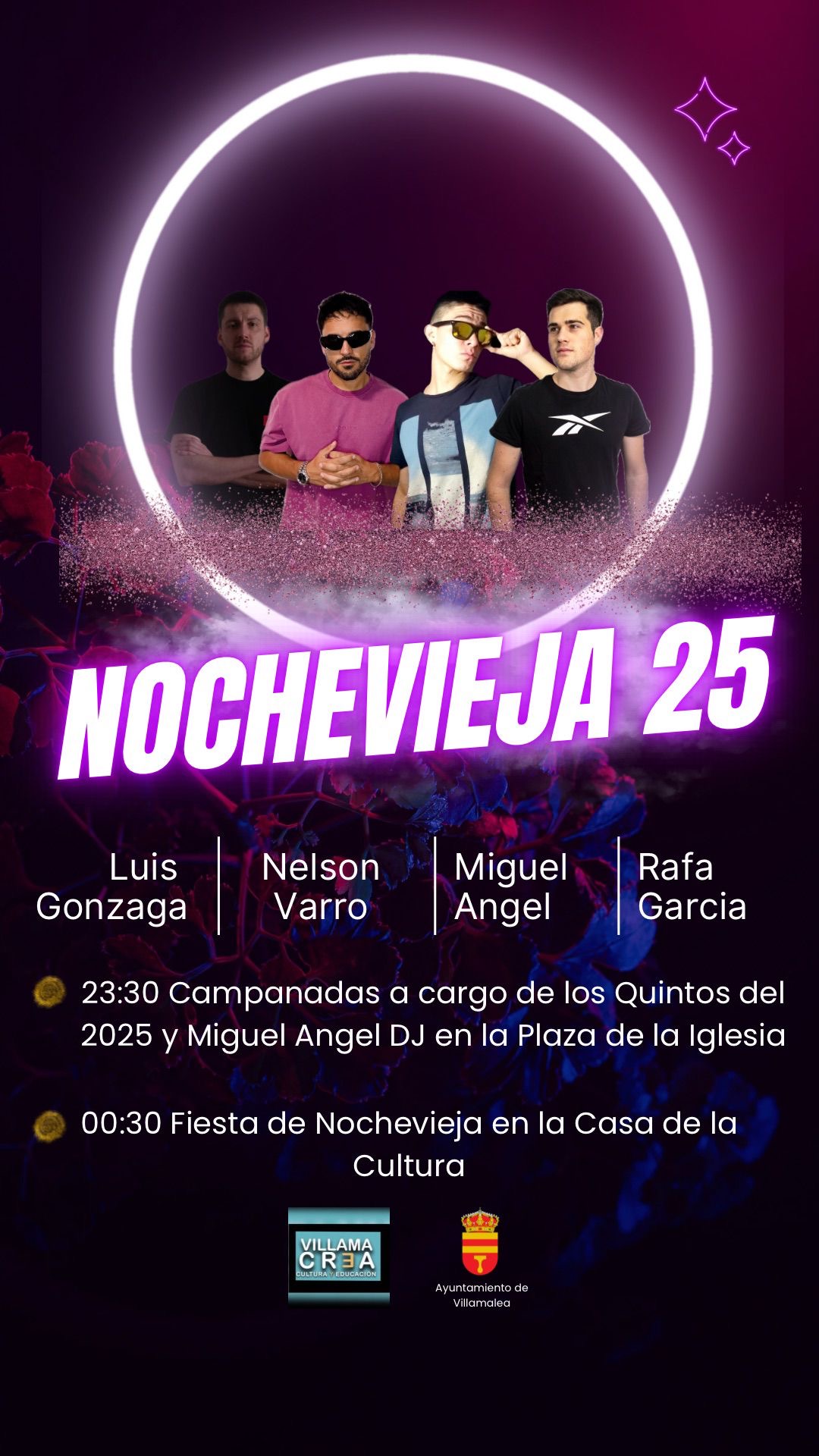🕦 23:30 · Campanadas en la Plaza de la Iglesia con Miguel Ángel DJ + Quintos 2025