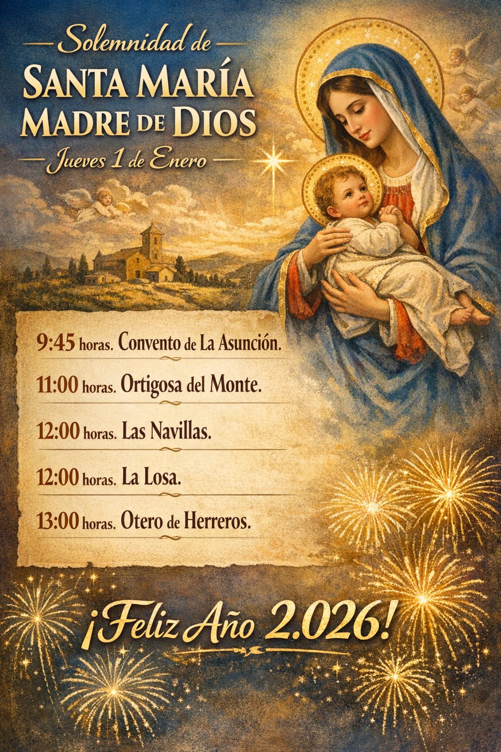 Se informa del horario de misa del día 1 de enero, a las 12:00 horas en Navas de Riofrío.