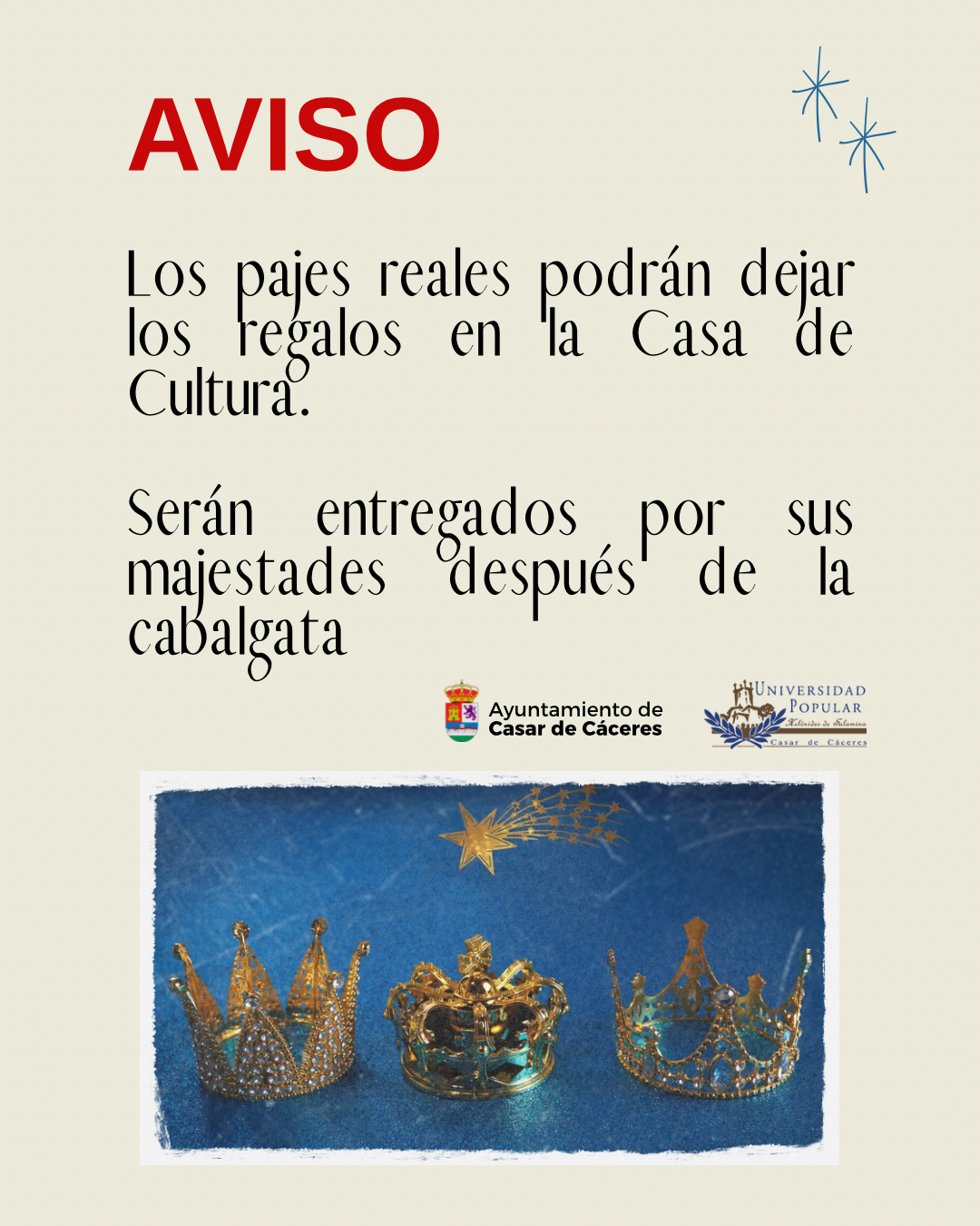 Como cada año, una vez pasada la Cabalgata, sus Majestades los Reyes Magos de Oriente, entregarán, de manera personal, los regalos a todos los niños. Para ello, se empezarán a recoger regalos, viernes 2 (mañana y tarde) y lunes 5 (solo en horario de mañana), en la Casa de Cultura.
