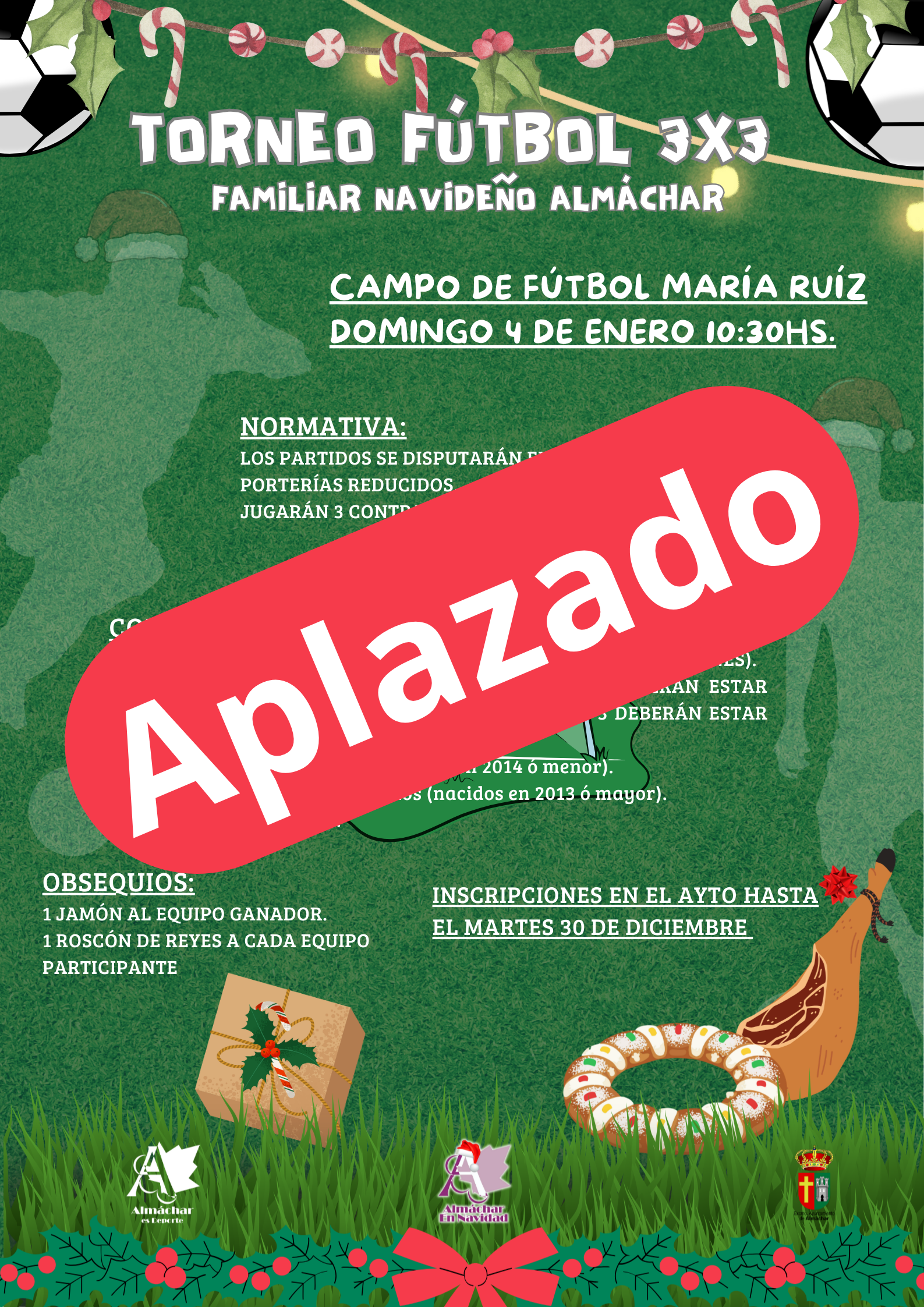 El Torneo de Fútbol 3x3 Familiar Navideño de Almáchar, previsto para este domingo 4 de enero, queda aplazado ⏸️ debido a la previsión meteorológica adversa 🌧️🌬️.