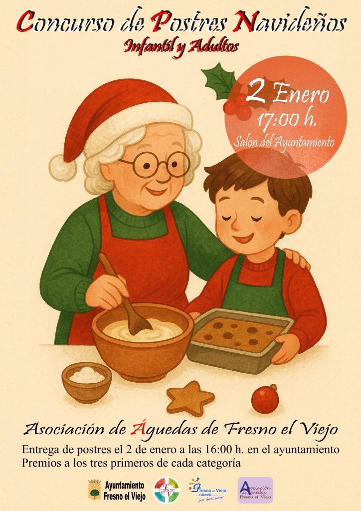 CONCURSO DE POSTRES NAVIDEÑOSInfantil y AdultosLa Asociación de Águedas de Fresno el Viejo organiza una deliciosa cita para disfrutar en familia y poner a prueba el talento repostero del municipio.