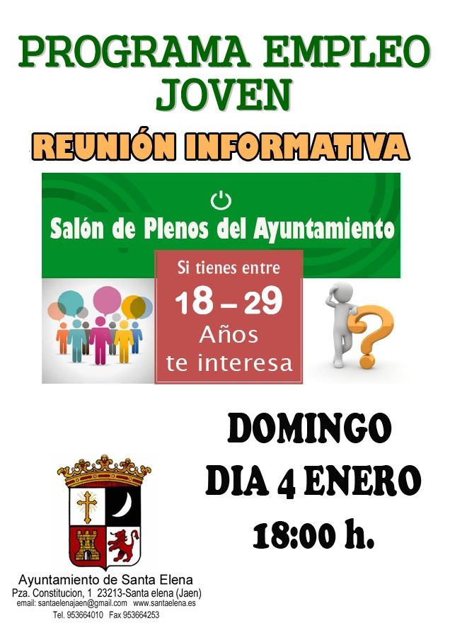 Reunión informativa del Programa de Empleo para Jóvenes entre 18 y 29 años. Domingo 4 de Enero a las 18 horas en el Salón de Plenos del Ayuntamiento de Santa Elena.