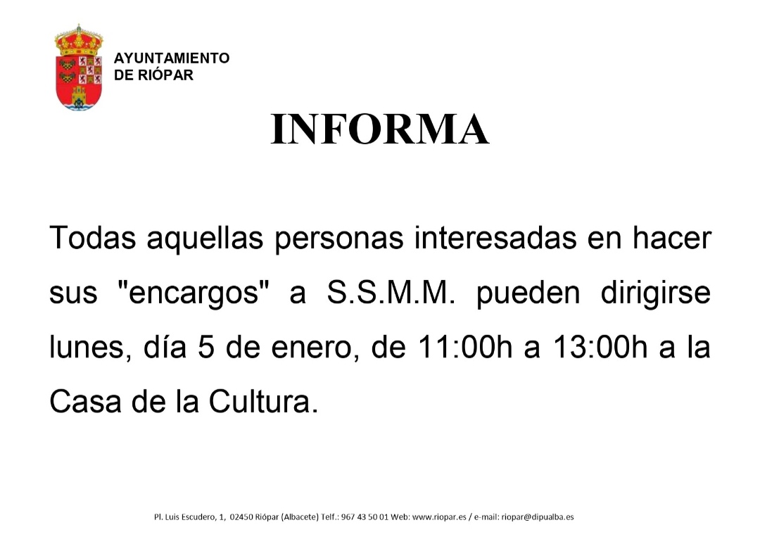 Todas aquellas personas interesadas en hacer sus "encargos" a SS MM pueden dirigirse el lunes, día 5 de enero, de 11:00 h a 13:00 h a la Casa de la Cultura.