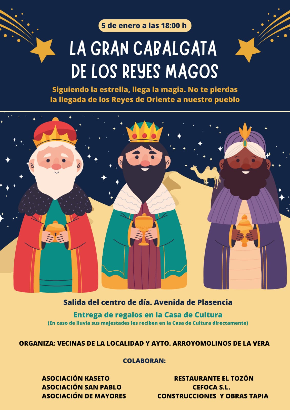 Hoy, a las 18:00, saldrá la Cabalgata de Reyes desde el centro de mayores.Esta mañana se recogen los juguetes en la casa de cultura de 11:00 a 13:00 horas.Se adjunta cartel informativo.