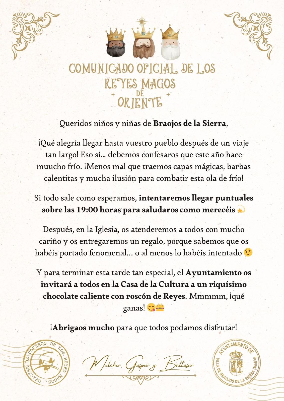 Sus Majestades Los Reyes Magos de Oriente nos han hecho llegar esta información sobre su visita de hoy a Braojos 💫