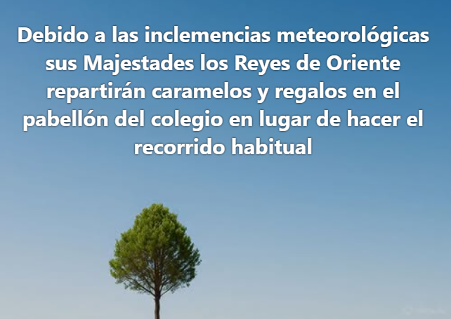 Debido a las inclemencias meteorológicas sus Majestades los Reyes de Oriente repartirán caramelos y regalos en el Pabellón del Colegio en lugar de hacer el recorrido habitual. Nos vemos a la misma hora.