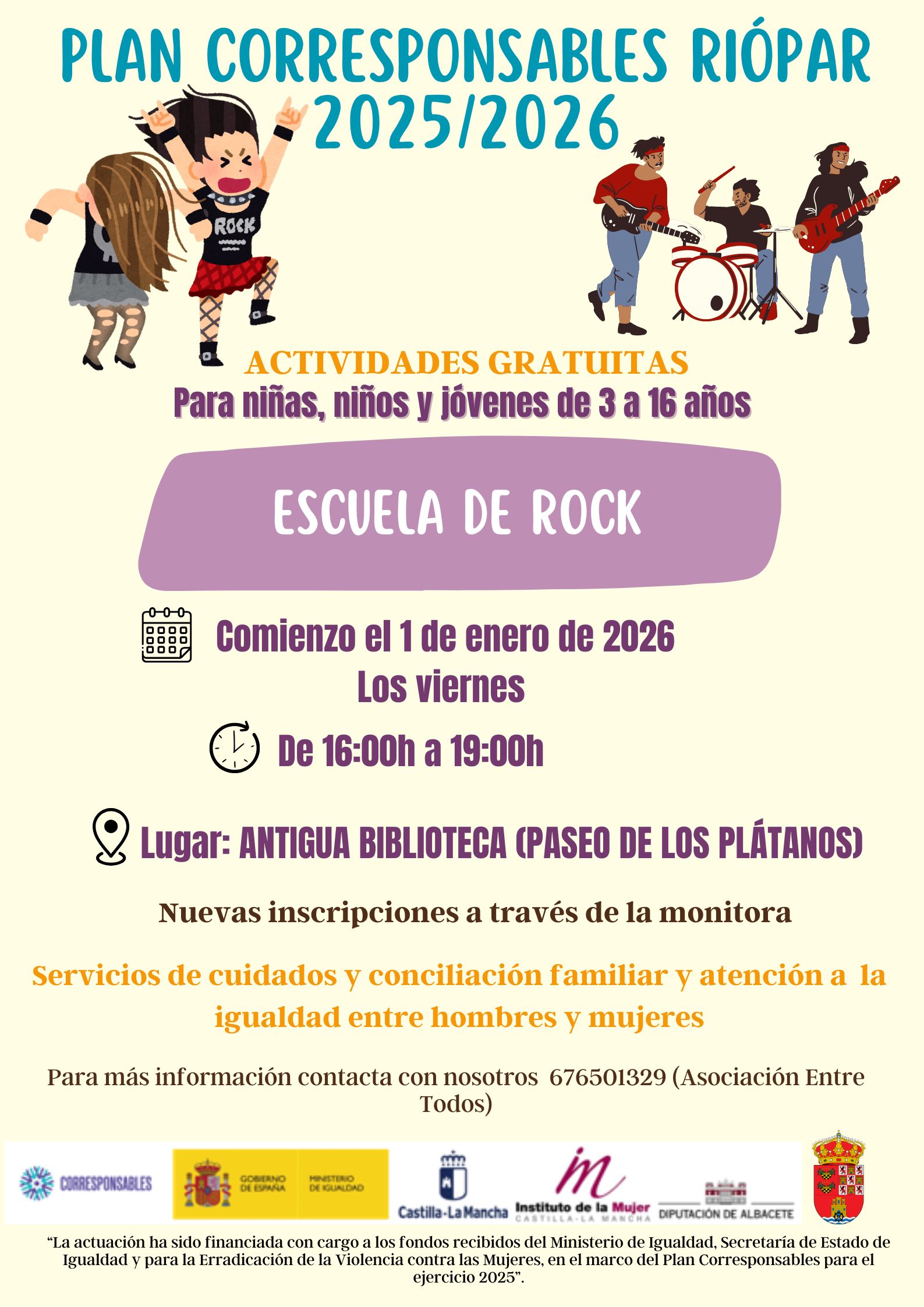 Retomamos la segunda fase de la Escuela de Rock a través del Plan Corresponsables. Servicio de cuidados y conciliación familiar y atención a la igualdad entre hombres y mujeres para niños, niñas y jóvenes de 3 a 16 años.