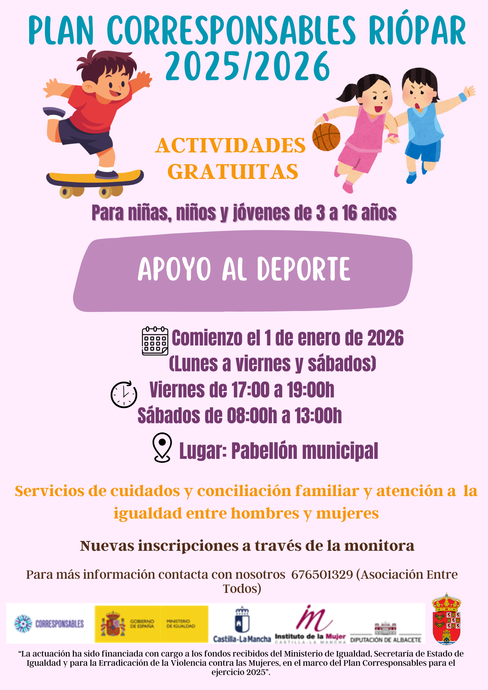 Retomamos la segunda fase del servicio de Apoyo al Deporte a través del Plan Corresponsables. Servicios de cuidados y conciliación familiar y atención a la igualdad para niños, niñas y jóvenes de 3 a 16 años.