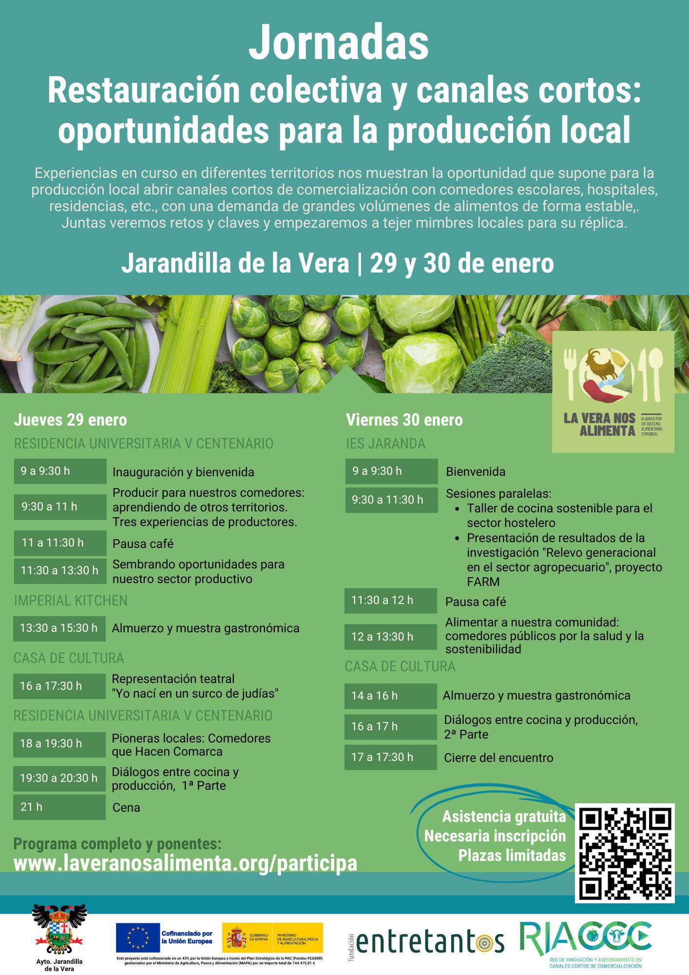 Recordamos que los días 29 y 30 de enero se celebran en Jarandilla de la Vera las jornadas "Restauración colectiva y canales cortos: oportunidades para la producción local". Dos días para analizar y debatir sobre la producción local de alimentos y su distribución a comedores próximos. También será una oportunidad única para conocer buenas prácticas y degustar los cocinados de tres chefs veratos. Asistencia gratuita.