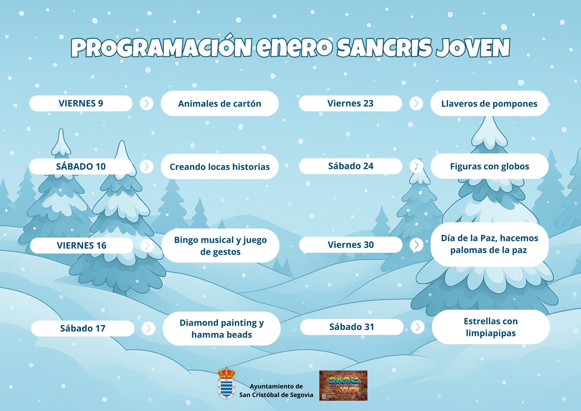 Cada viernes y sábado del mes, te invitamos a participar en talleres únicos pensados para jóvenes con ganas de pasarlo bien, aprender y compartir. Desde manualidades con pompones y globos hasta juegos de historias locas, diamond painting y un especial por el Día de la Paz.