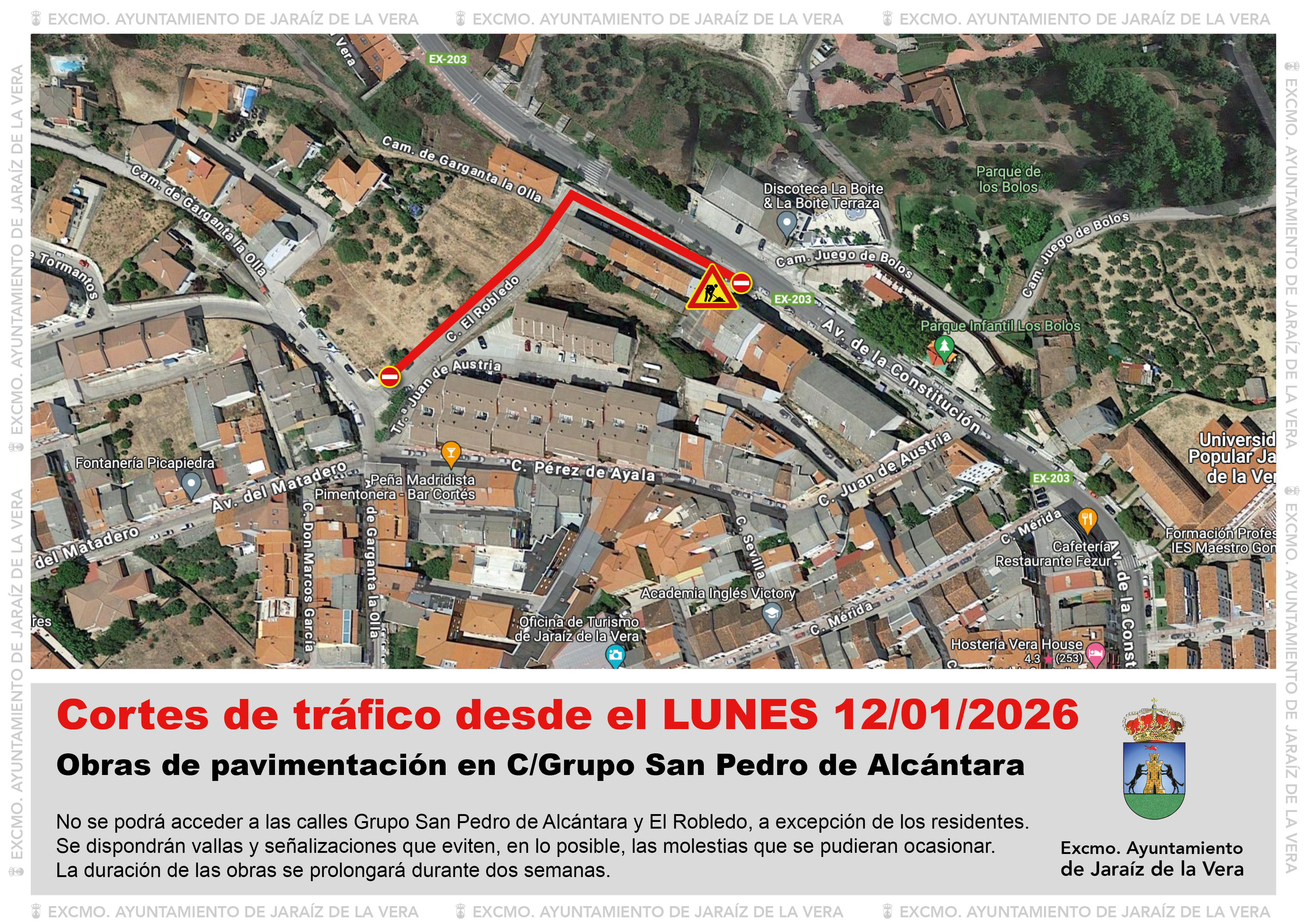 El Ayuntamiento de Jaraíz de la Vera informa que, la empresa del agua ACLARA va a acometer las obras de reparación del firme en la C/ Grupo San Pedro de Alcántara.