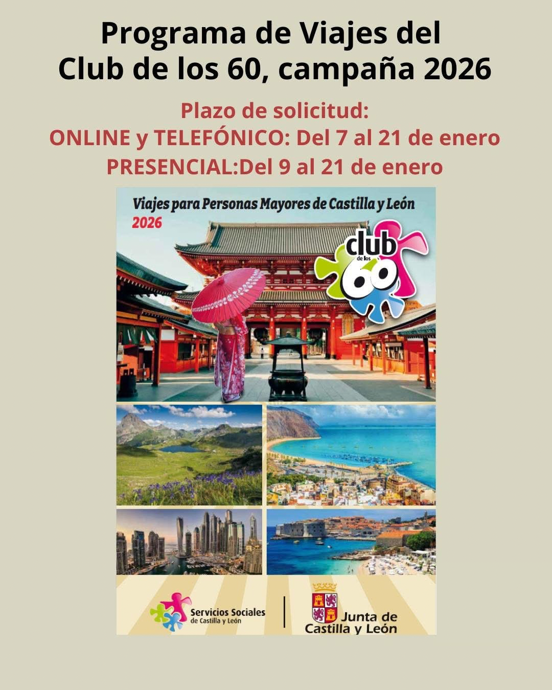 La Junta de Castilla y León ha abierto el plazo para participar en el programa de viajes del Club de los 60 2026 🧳✨, dirigido a personas mayores de 60 años residentes en la Comunidad.