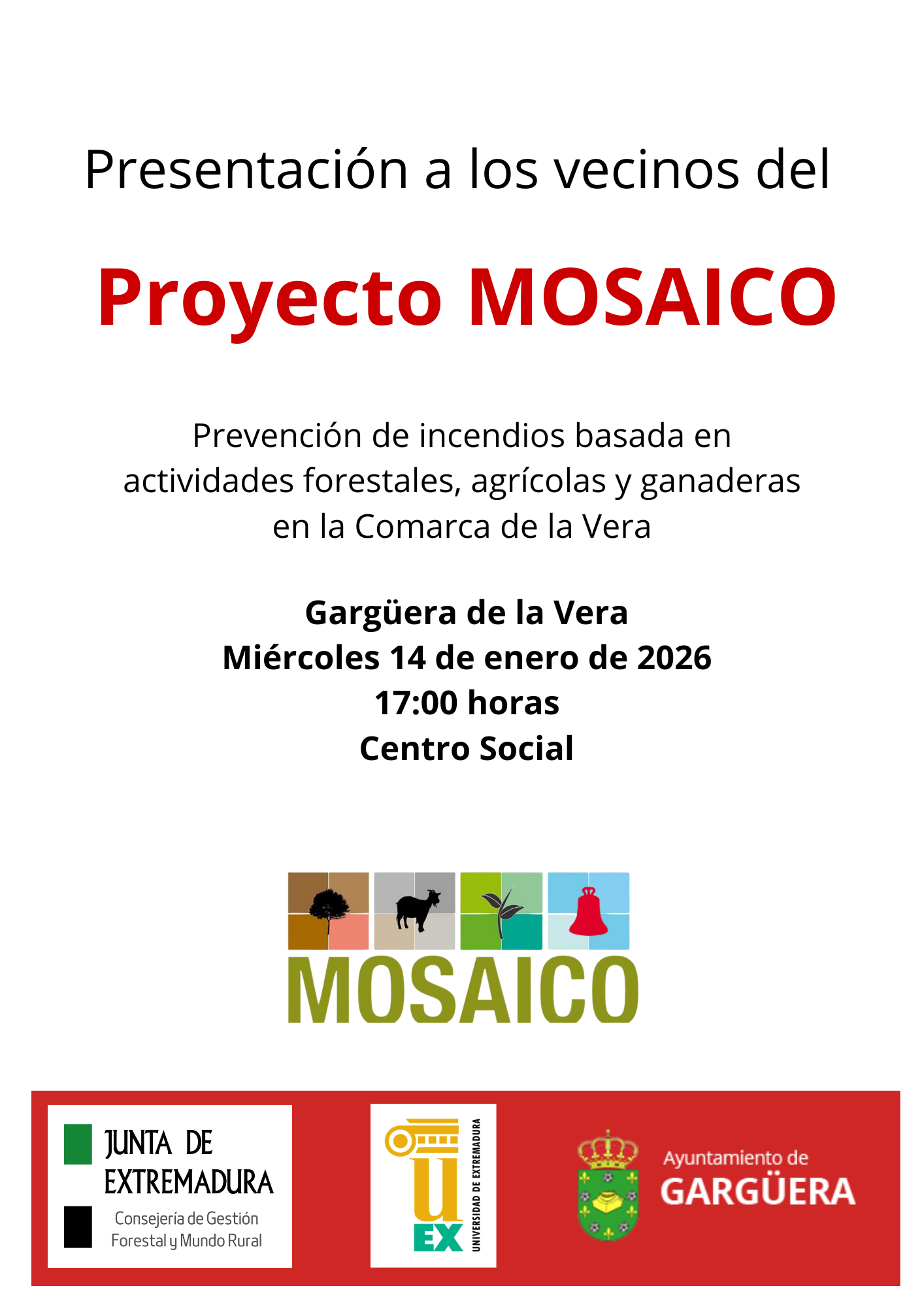 Se informa que el próximo miércoles, 14 de enero, se llevará a cabo en nuestro municipio la presentación pública del PROYECTO MOSAICO.